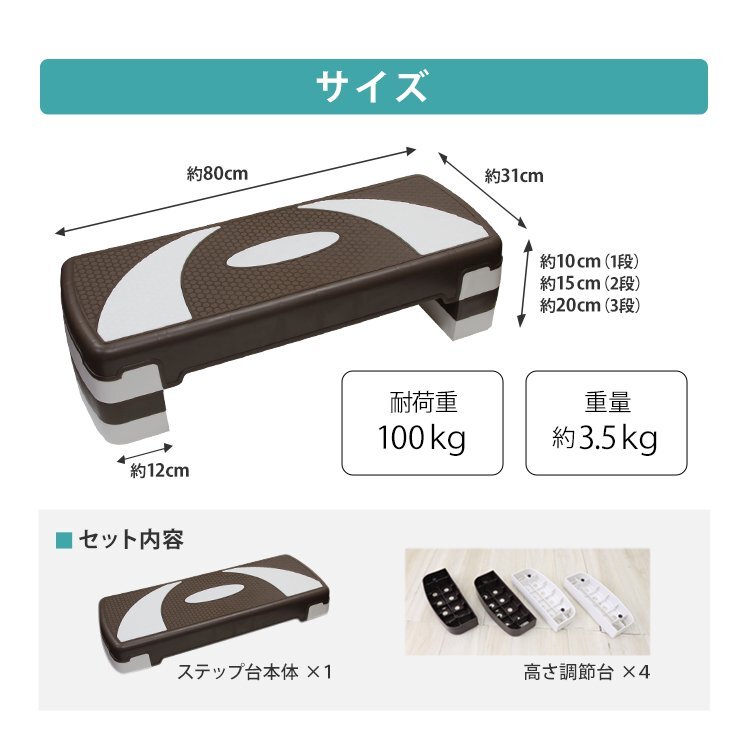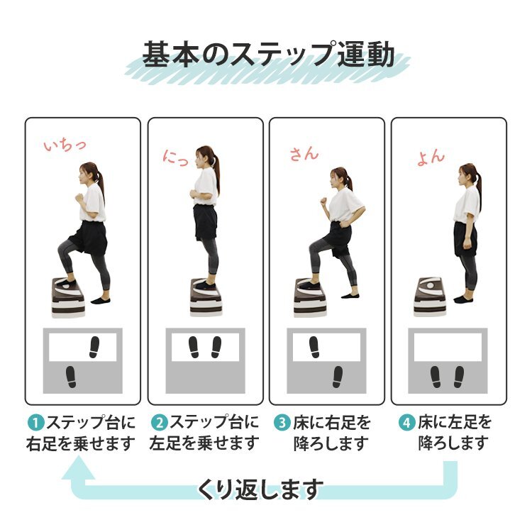 室内で気軽にステップ運動ができるエクササイズステップ。 テレビを観ながら、好きな音楽を聴きながら、自分の体力レベルにあった早さでステップを踏むだけ。 エアロビックの様な有酸素運動が簡単に出来ちゃいます♪ 本体背面に収納してある調整台で三段階の高さ調整ができるので、体力にあわせてエクササイズが可能。 膝裏ストレッチや二の腕ストレッチ、腕立て伏せなど・・・。 ステップ台 エクササイズ をはじめてみませんか。 【商品仕様】 カラー:ブラック/チョコレート(ブラウン) ※ご落札後のオーダーフォーム備考欄よりご希望のカラーをご記入ください。 記入が無い場合、在庫切れの場合ランダム発送させていただく場合がございます。 本体サイズ(約):幅80cm×奥行き31cm×高さ10cm/15cm/20cm(三段階調節) ※未使用時は調節台をコンパクトに収納可能 重量(約):3.5kg 素材:PP(ポリプロピレン) 耐荷重(約):100kg ※グレー部分は取り外しできませんので、絶対に取り外さないでください。高さ調節の為ではなく、デザインの一部です。高さ調節台は黒の脚のみです。 ※こちらの商品は家庭用となります。施設などでのご使用はお控え下さい。 ※高齢の方、お子様がご使用になる場合は必ず指導者や保護者の方が付き添って下さい。 |