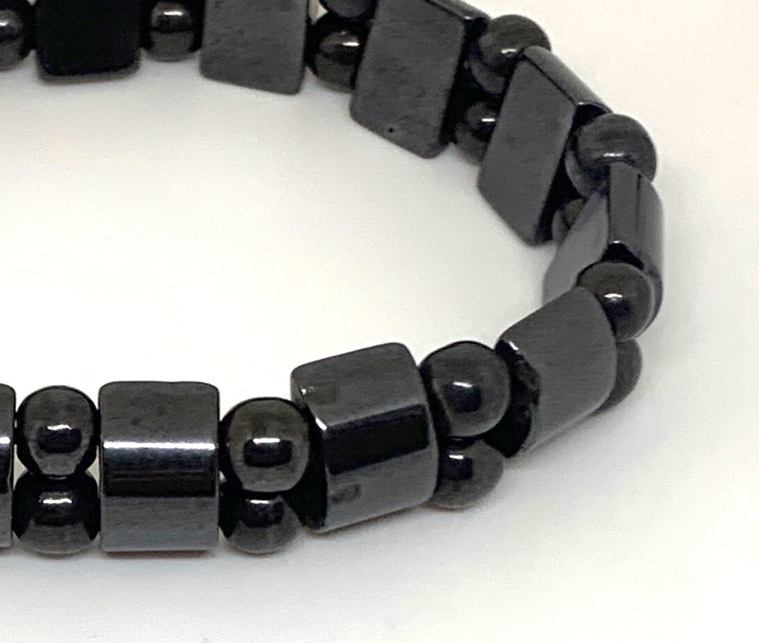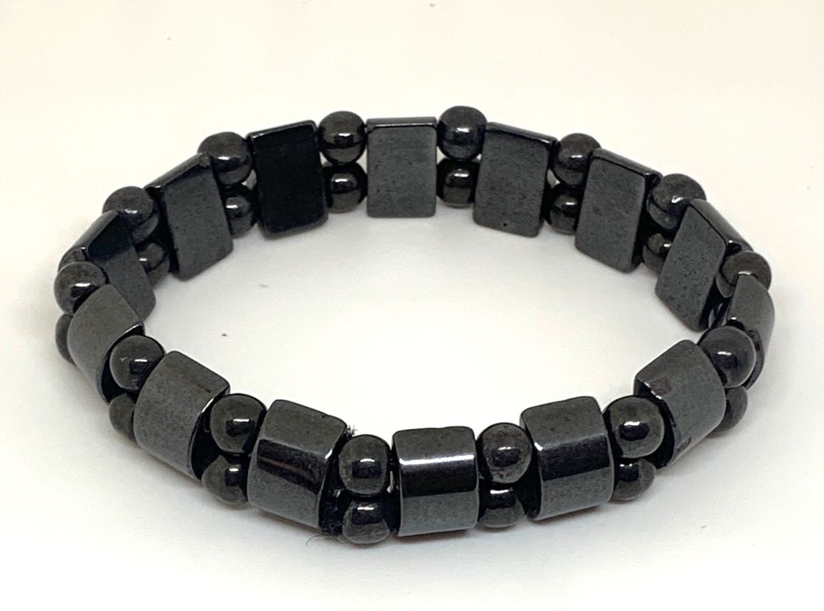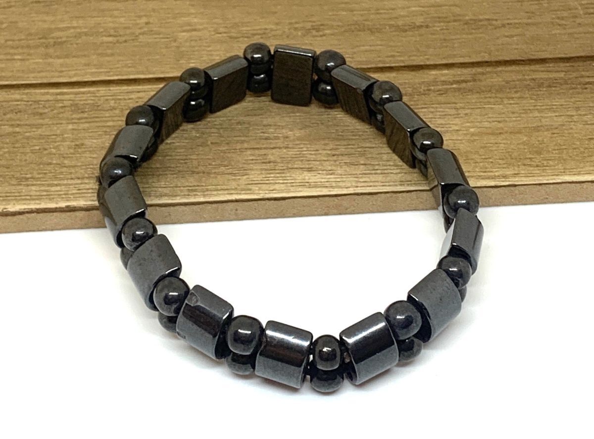 スタイリッシュなヘマタイト磁気ブレスレットのご案内です。磁気ヘマタイトは身に着ける人の血液にエネルギーを与えるとされています。赤血球の働きを活性化し、全身への酸素供給量が高める事から、運動能力を高める効果や肉体労働をされている方には特におすすめで持久力を高めると言われています。(薬事効果を保証するものではありません)コーティングはありますが、ヘマタイトは鉄分を含むため、汗は早めに落とし汚れは乾いた柔らかい布で軽く落としてください。手首サイズ18センチまでの方に。