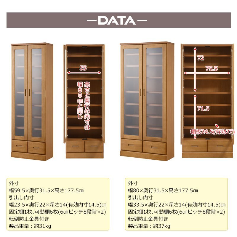 ■扉内寸/(約)幅75.5×奥行27(可動棚24.5)×高さ(上段72・下段71.5)cm