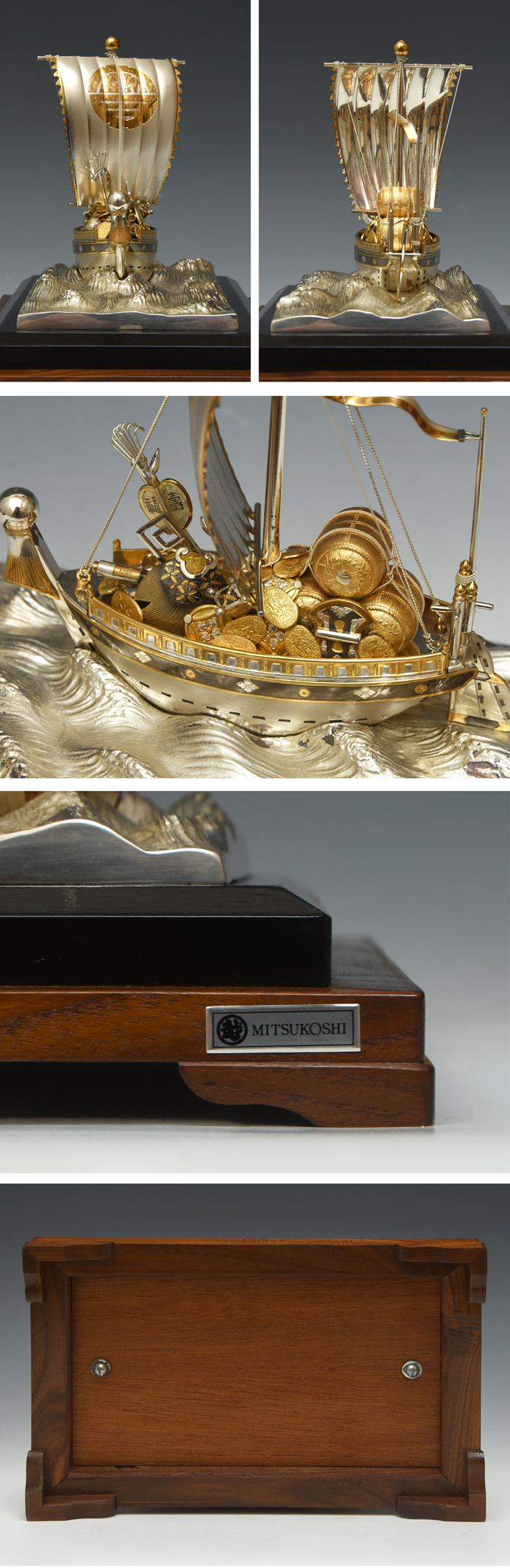[寶船(銀製部分)] 横幅:15.2㎝ 奥行: 8.8㎝ 高さ:14.5㎝ 重量: 260g [波台座 (銀メッキ部分)] 横幅:20.3㎝ 奥行:11.0㎝ 重量: 740g [ガラスケース] 横幅:27.0㎝ 奥行:17.5㎝ 高さ:24.5㎝ |