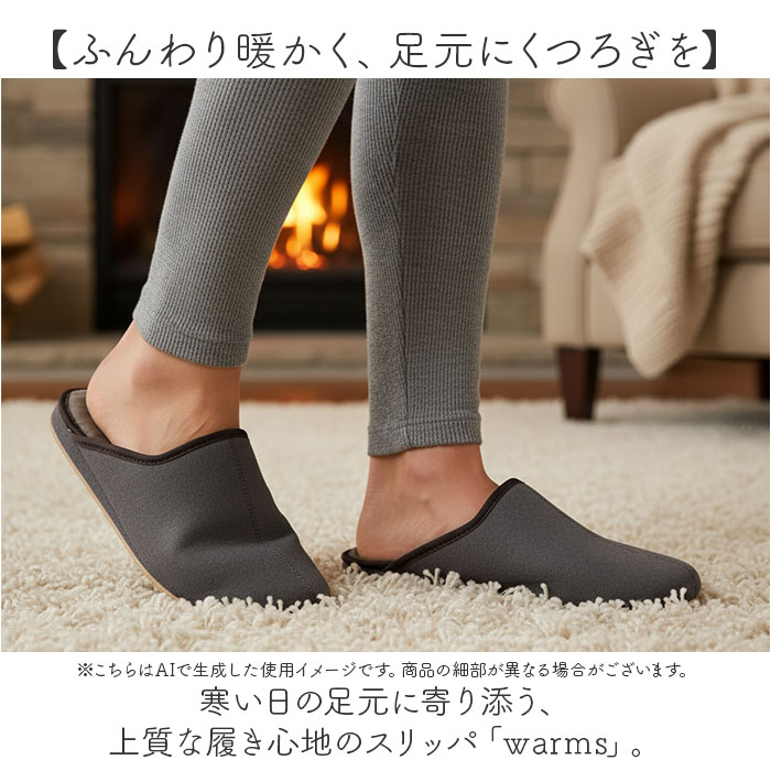 | 商品説明 | ・・【ふんわり暖かく、足元にくつろぎを】 ・寒い日の足元に寄り添う、上質な履き心地のスリッパ「warms」。 ・ ・【ファー素材で足元ぽかぽか】 ・内側のファー素材が足を包み込み、寒い日でも快適に過ごせる履き心地◎ ・ ・【パタパタ音がしにくい底面加工】 ・フローリングの床でも滑りにくく、静音効果のあるポリエステルスエードに滑り止め付きの底で安心。 ・ ・【つま先上がりで歩きやすい】 ・小さな段差でもつまづきにくい♪スリッパ先端には、歩きやすい「つま先上がり形状」を採用。 ・ ・【しっかりとしたフォルム】 ・靴の製法を取り入れて仕上げた、しっかりとしたフォルム。階段の踏み込み板にぶつかっても衝撃からガード。 ・ ・【男女兼用のシンプル設計】 ・無地でスッキリとしたデザインが男性女性問わず幅広い年齢層にマッチ♪ |