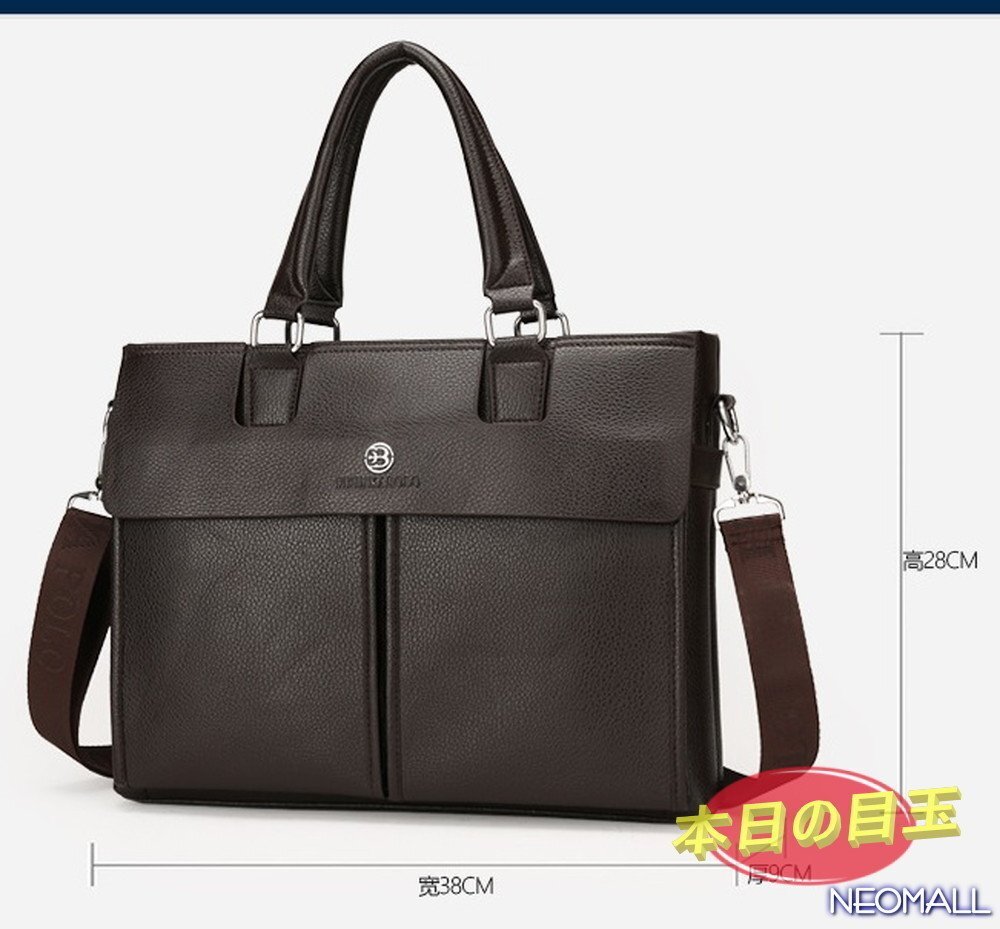 1円〜 新品 メンズ 高級PUレザー ビジネスバッグ【606】ブラック ブリーフケース ショルダー スクエア 横型 大人気 質感◎