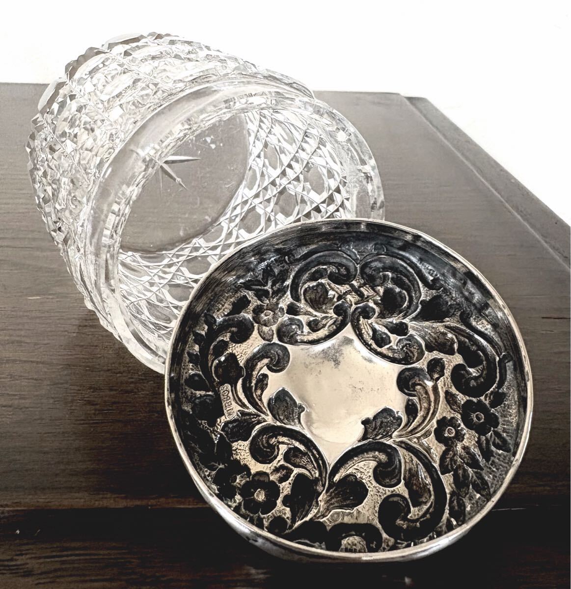 英国アンティーク ガラスケース 円/筒型 大 草花 彫金装飾 幾何学模様 ヴァニティー シルバー純銀194g エドワード期1906年ロンドンBros社製