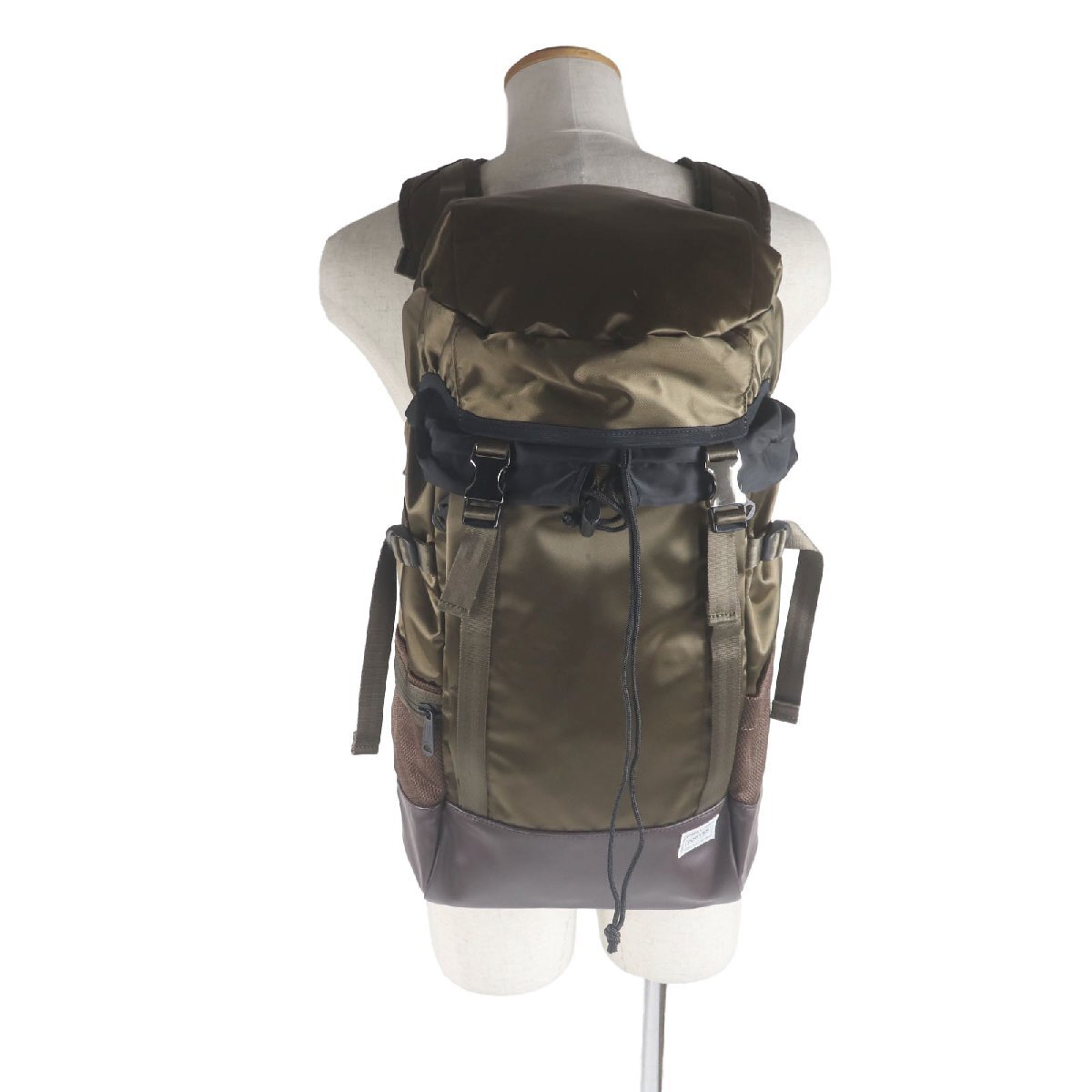 サイズ (size) | 【実寸】高さ:約46cm 幅:約32cm 奥行:約14cm 【仕様】メイン開閉式:巾着 メイン収納数:1 外側:ファスナーポケット2 オープンポケット1 内側:マジックテープポケット1 オープンポケット1 | ||||||||||||||||