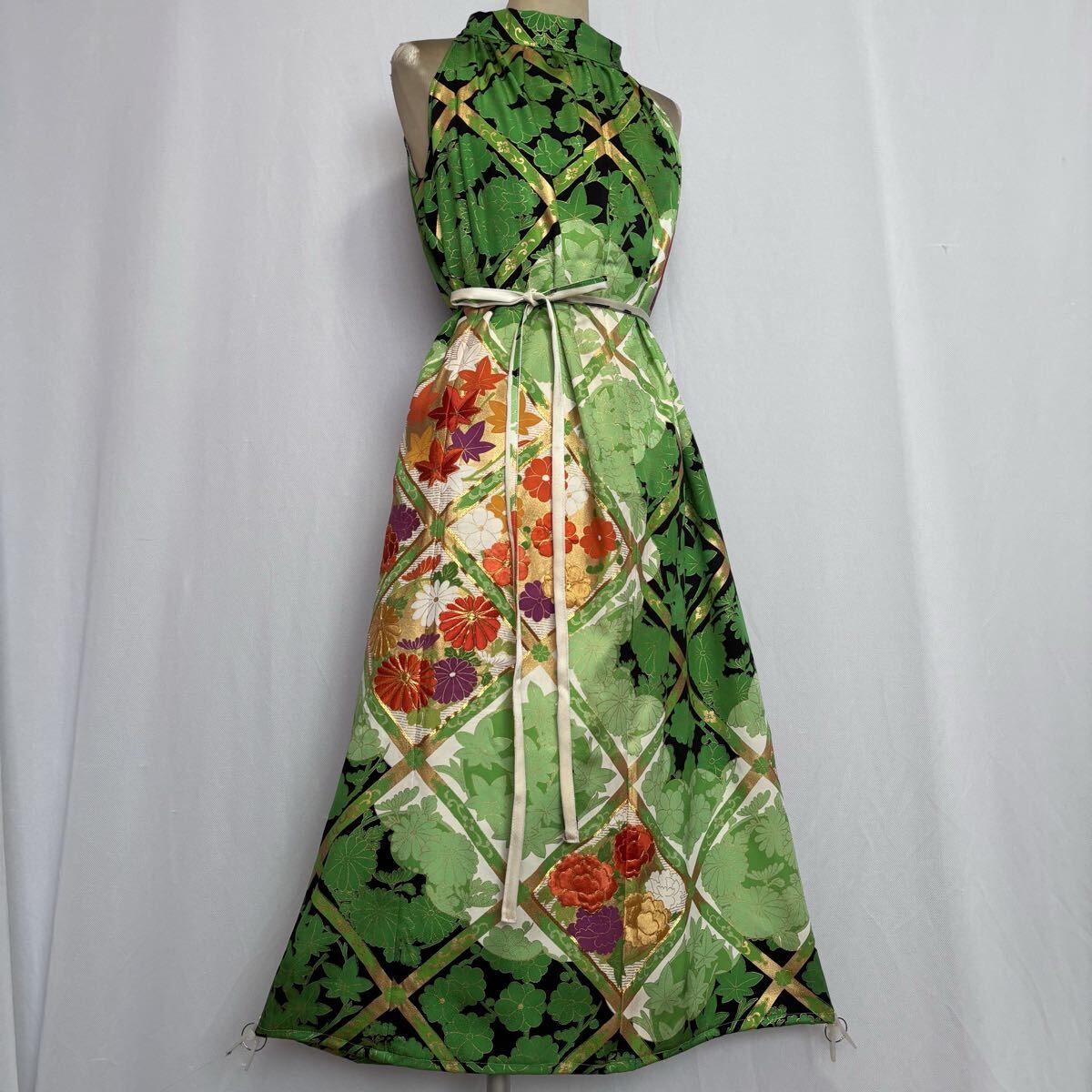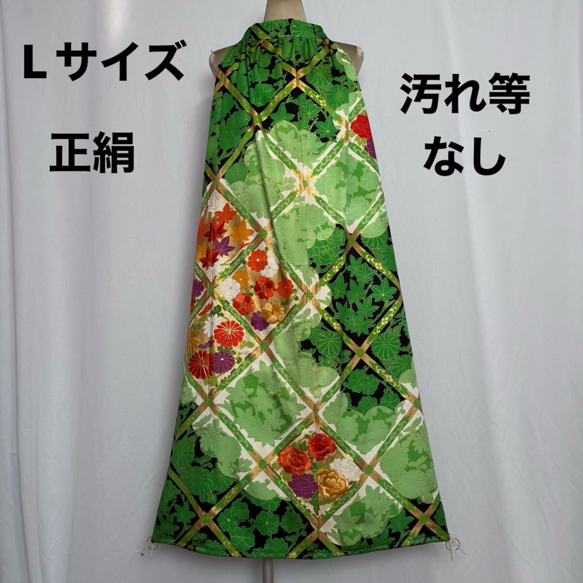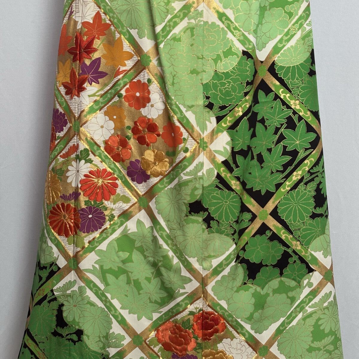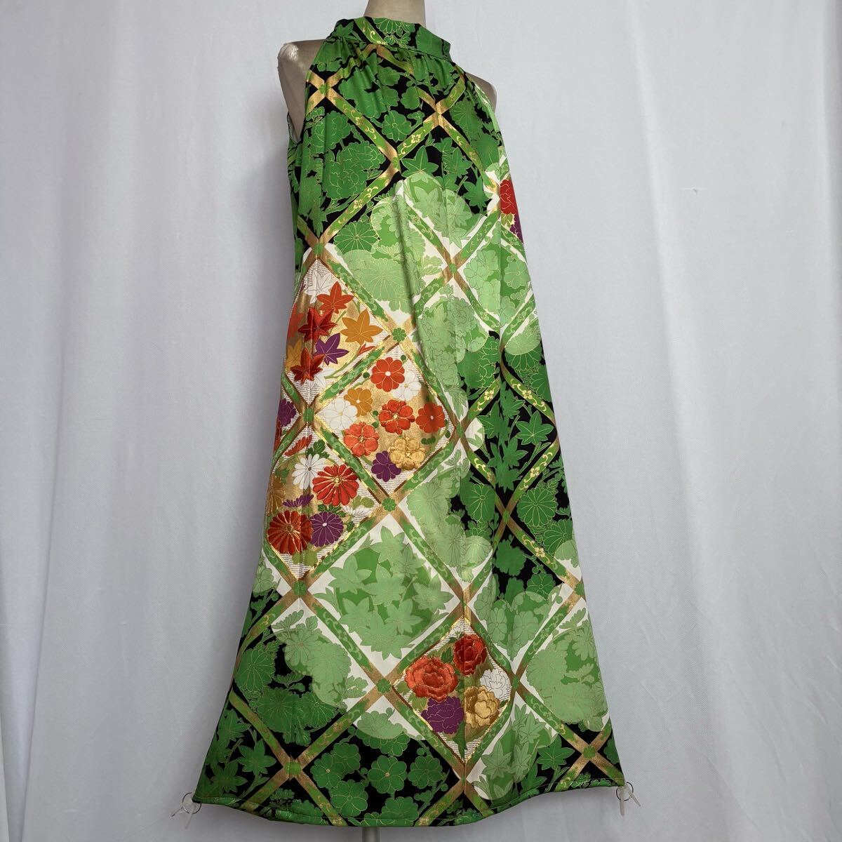 ★237★黄緑黒白振袖ホルターネックロングワンピース・ストール★金箔菱形花々駒刺繍★L★正絹