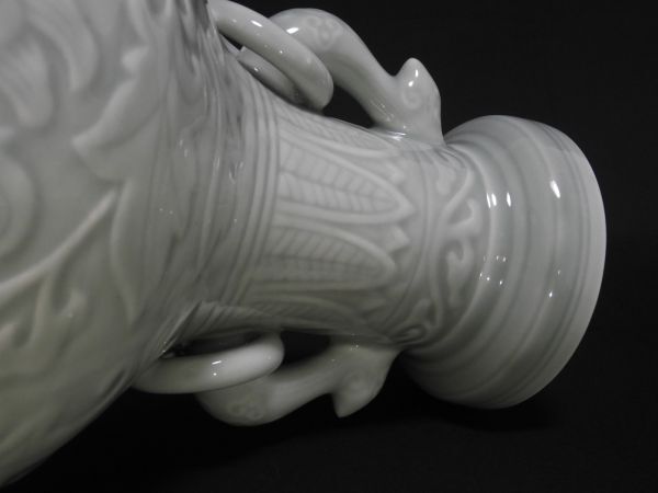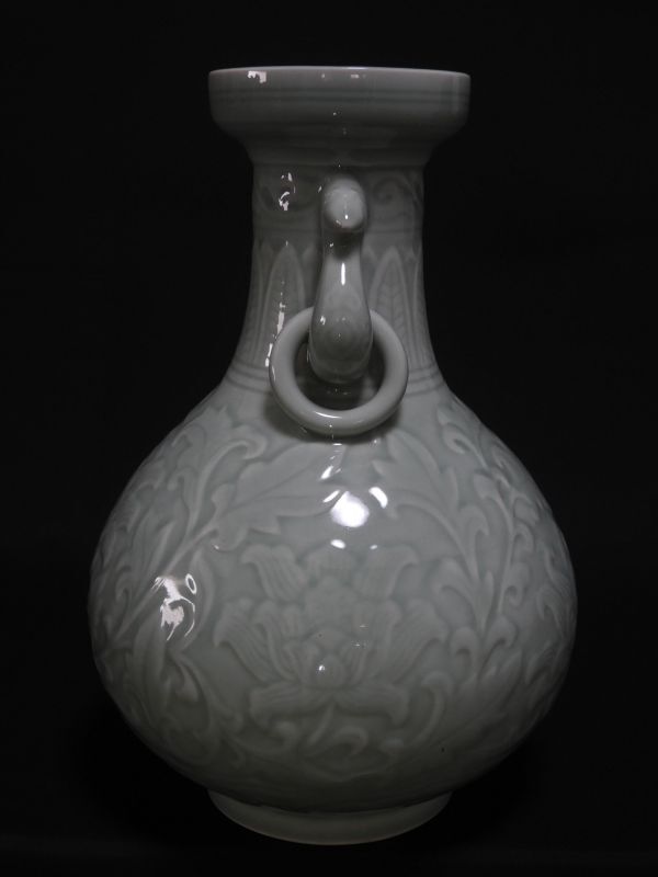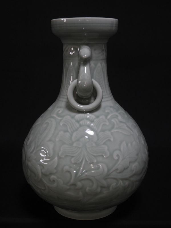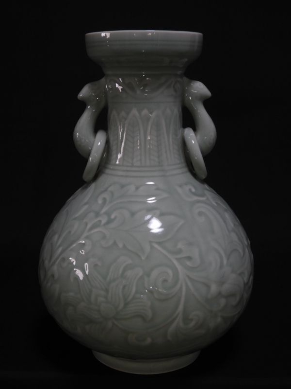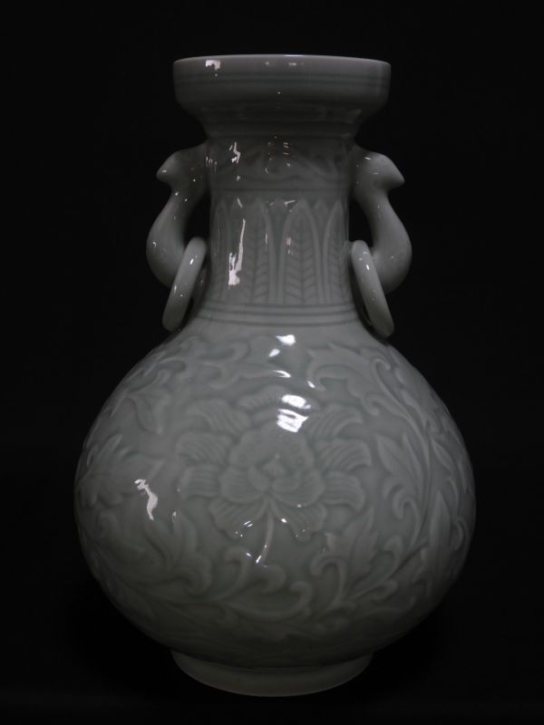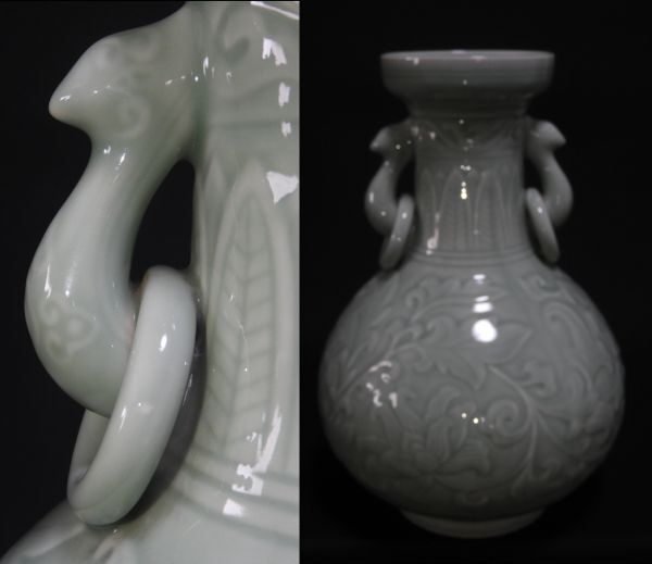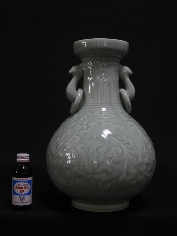 花器 耳付鳥花花器 (龍泉窯) 青磁 高さ約 37㎝ 中国美術 壺 置物 飾 【送料無料】