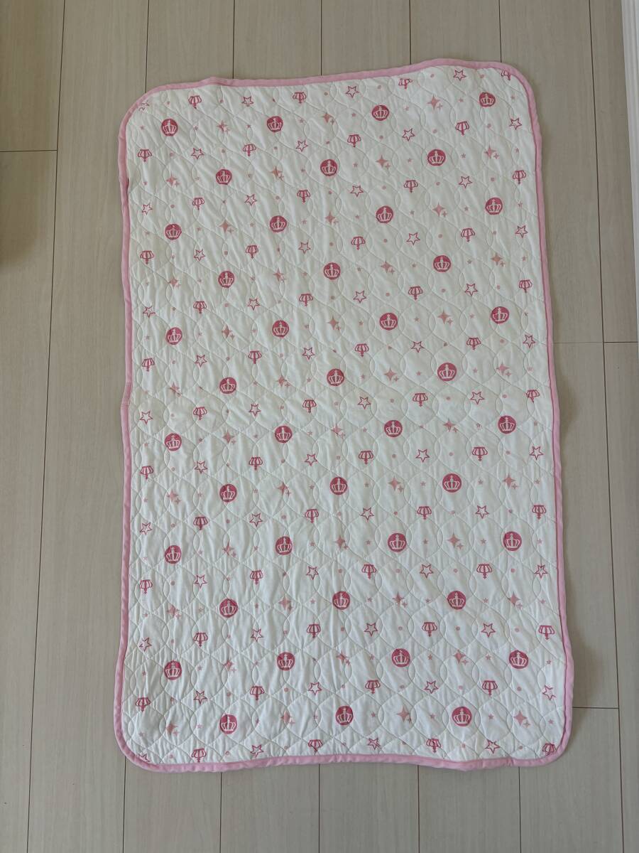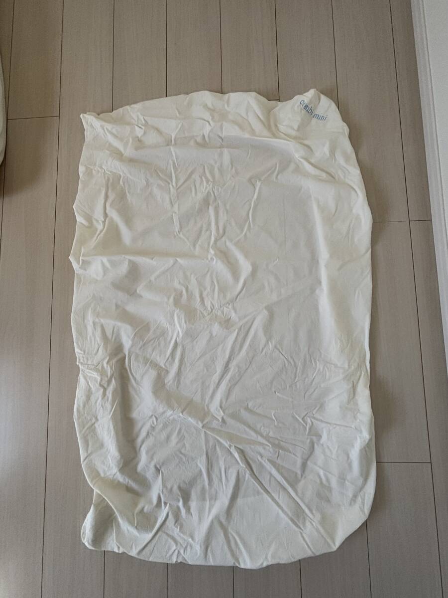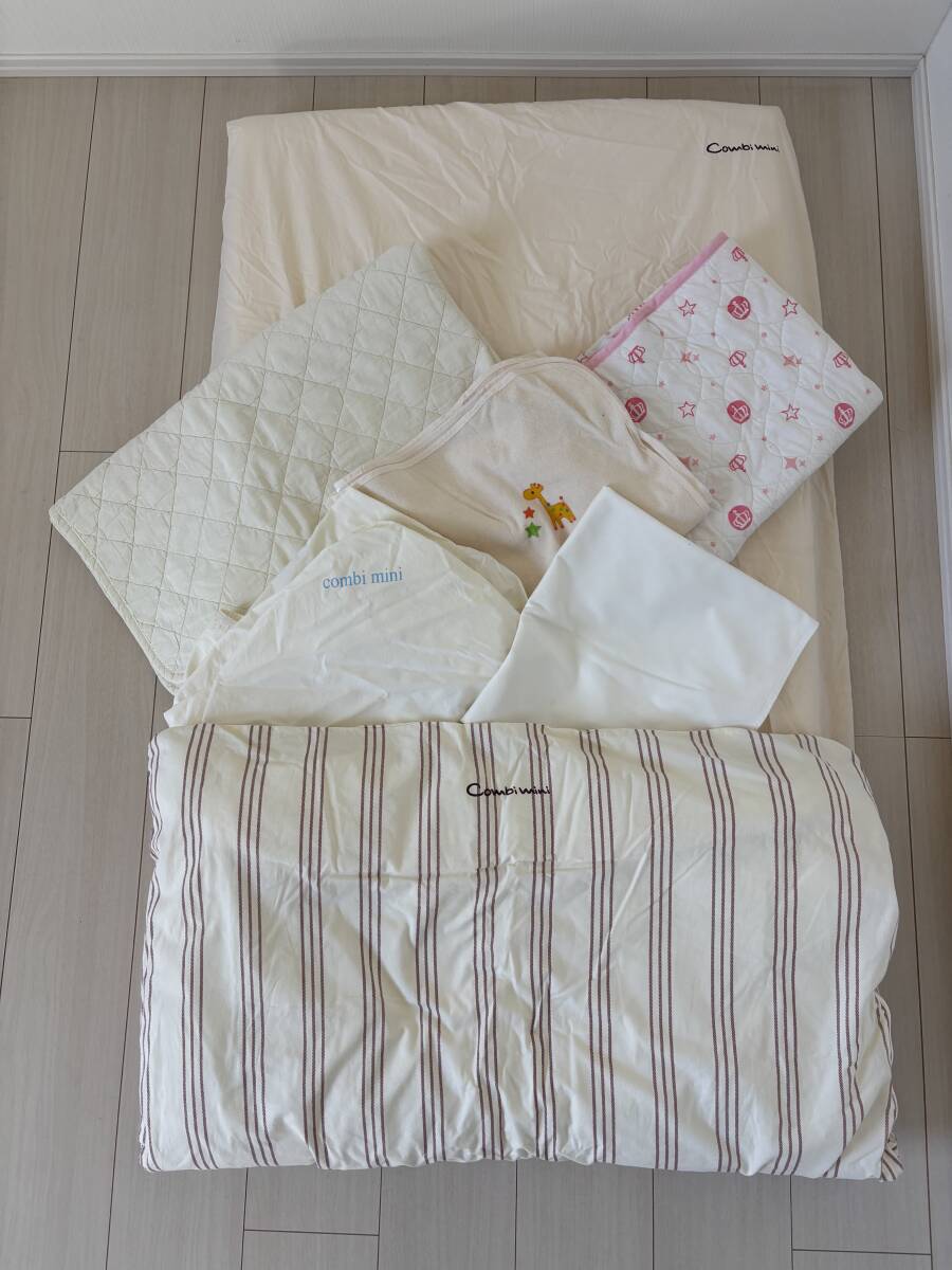 combi miniの物は敷布団と敷布団カバー2点、掛け布団と掛け布団カバー、防水シーツ、キルトシーツの7点で、キリンの防水シーツとピンクのシーツはアカチャンホンポ等で追加購入した物です。