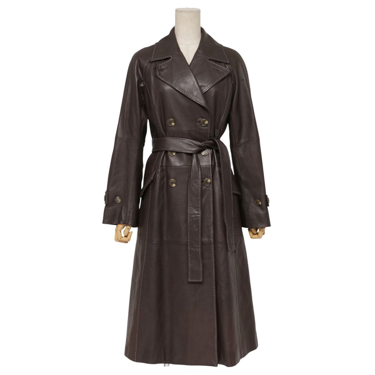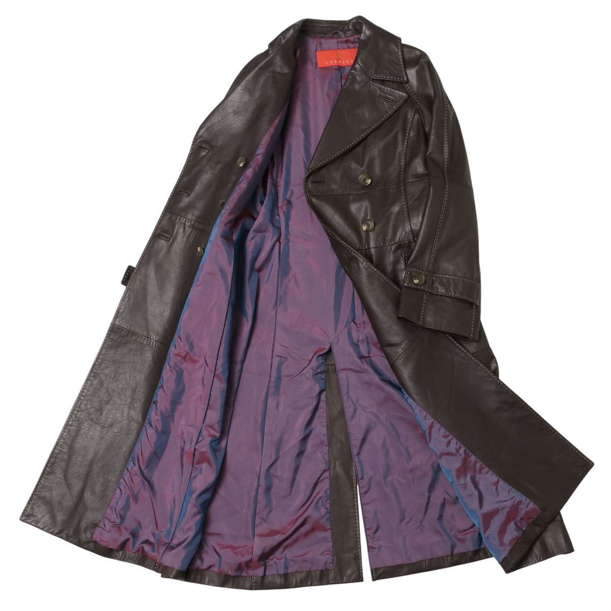 GS3917☆コルニーチェ CORNICE 羊革 ロングコート ベルテッドコート ダブルブレスト ステッチ シープスキン レザー ブラウン サイズ38 | |||