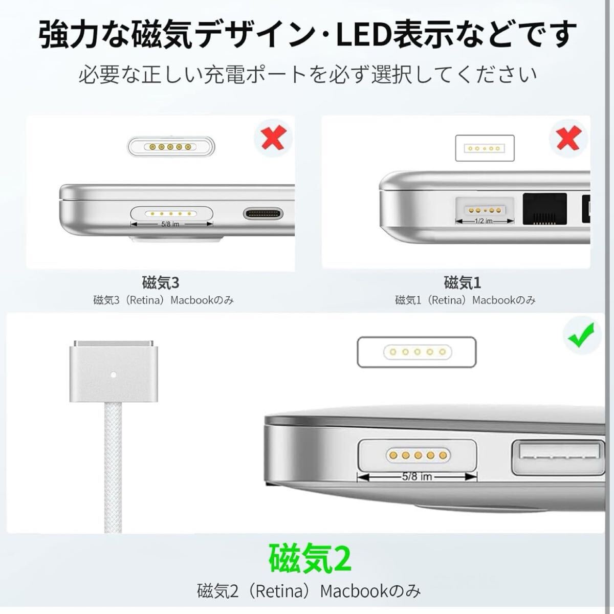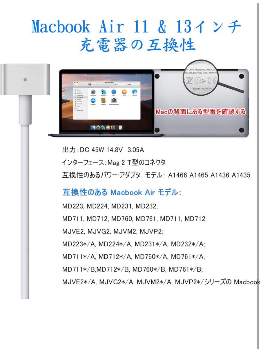 Macbook Air 充電器 45W Mag 2 T型電源アダプター急速充電器は、自宅、オフィス、外出先で急速充電を実現します。入力 AC 100-240V;出力:DC 14.85V 3.05A 45W 。