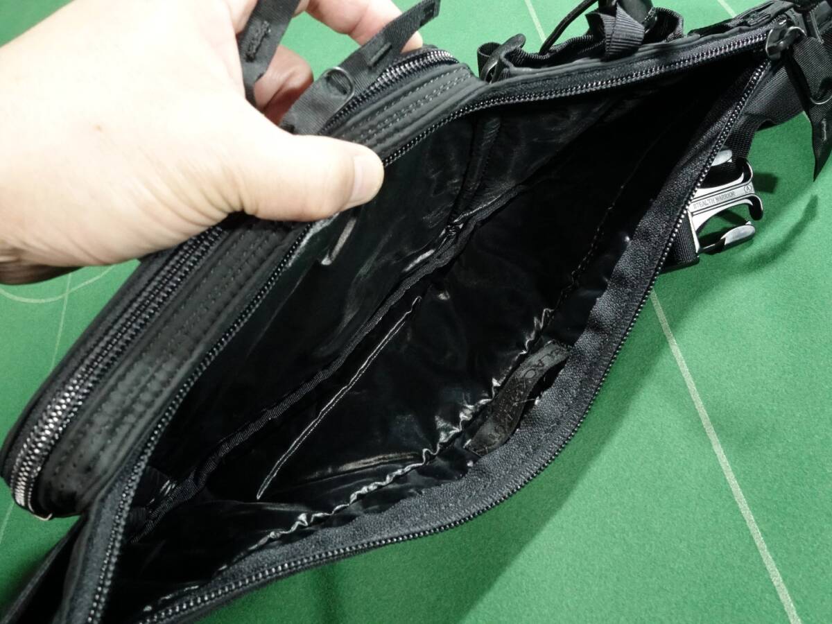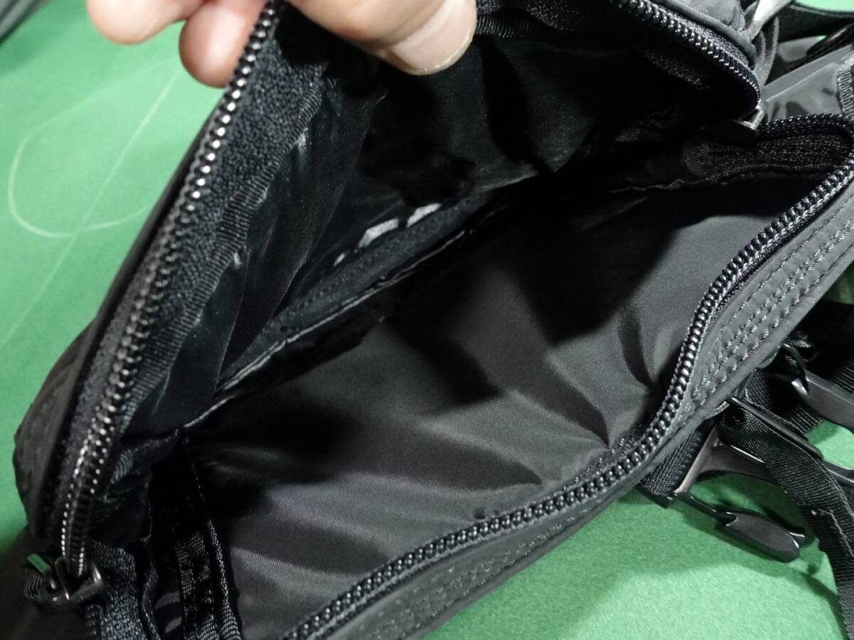 中央に立体ジッパーポケット1つあり、内部にはポケット等はありません。