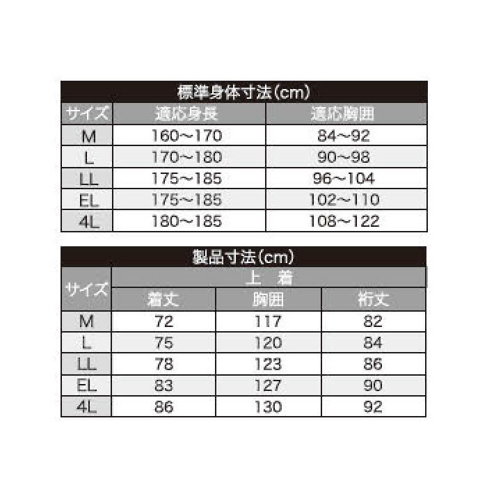 | サイズ | M、L、LL、EL、4L 【参考標準身体寸法】 ・Mサイズ 適応身長:160cm~170cm 適応胸囲:84cm~92cm ・LLサイズ 適応身長:175cm~185cm 適応胸囲:96cm~104cm ・4Lサイズ 適応身長:180cm~185cm 適応胸囲:108cm~122cm 【製品寸法】 ・Mサイズ [着丈]約72cm [胸囲]約117cm [裄丈]約82cm ・LLサイズ [着丈]約78cm [胸囲]約123cm [裄丈]約86cm ・4Lサイズ [着丈]約86cm [胸囲]約130cm [裄丈]約92cm ※サイズについて詳細は、画像をご覧ください。 ※サイズは当店平置き実寸サイズです。実際の商品とは多少の誤差が生じる場合がございます。あらかじめご了承ください。 |