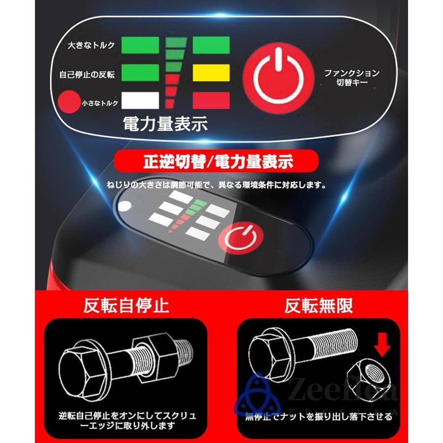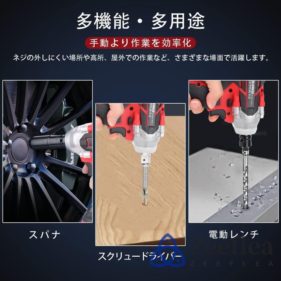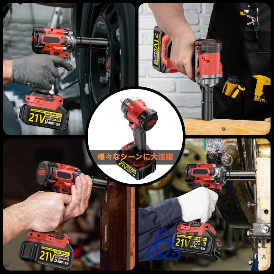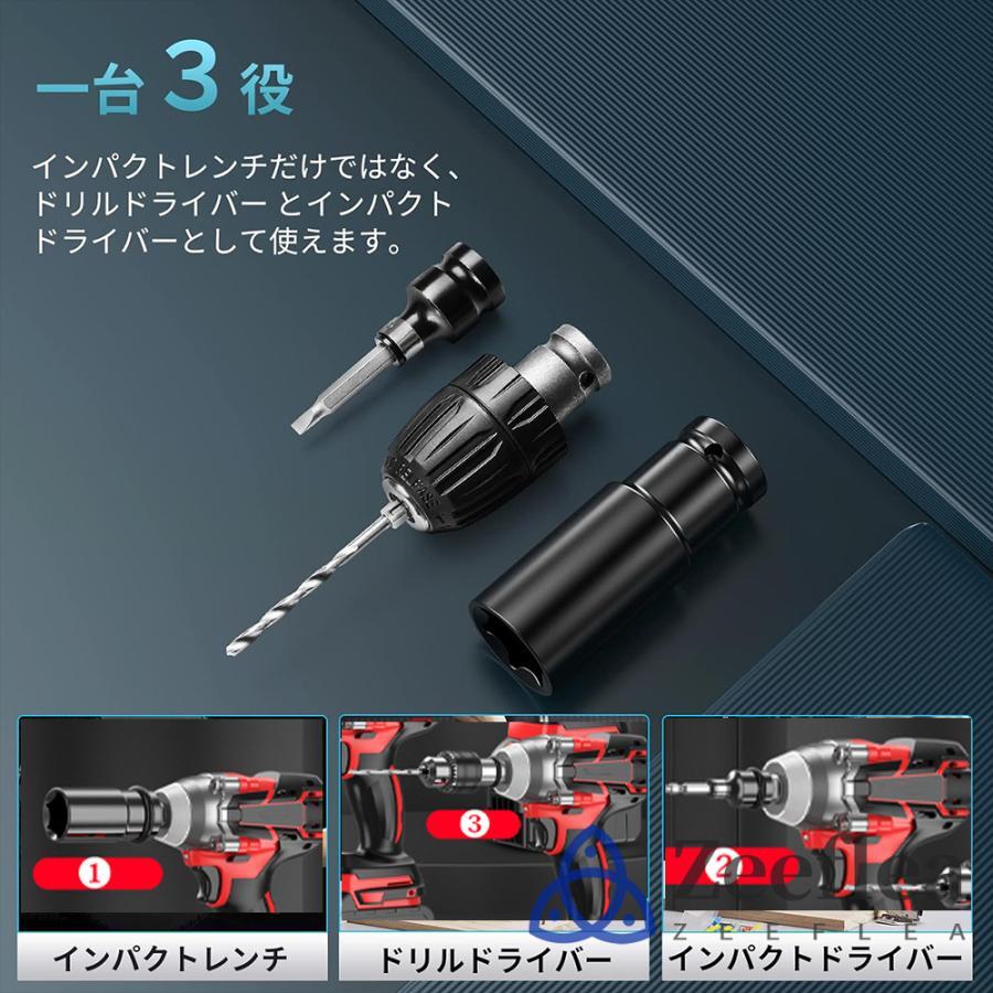 ナットのサイズに対応したソケットを差し込むだけで、すぐ応用でき、工具を使わず、自由に交換できる便利さを持ってます。「レンチ」-ナットとボルトを締めます。本体の差し込み角が12.7mm(1/2インチ)で、ほとんどの市販のソケットを使用でき、使えるに幅広いインパクトレンチです。「コードレスドライバー」チャックは、スクリュービットのねじ込みに適しています。六角ドリルでの掘削に運用可能です。LEDライトを搭載、回転と同時にLEDライトが点灯します。手元をしっかり照らしてくれるので、昼夜を問わず作業が可能です。