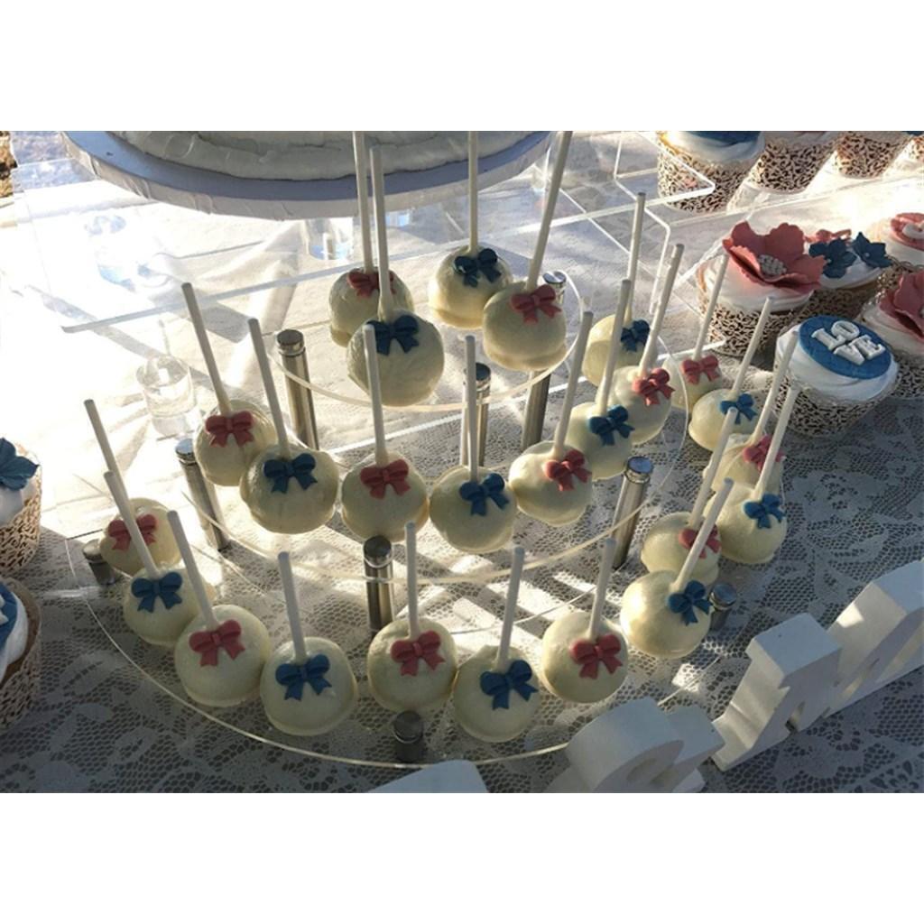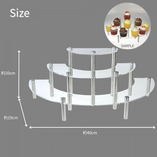 透明感の美しい見た目と3層ラックによって豊富な陳列を実現できるため、ケーキ、カップケーキ、ウェディングパーティーなど活用の幅も広がります。