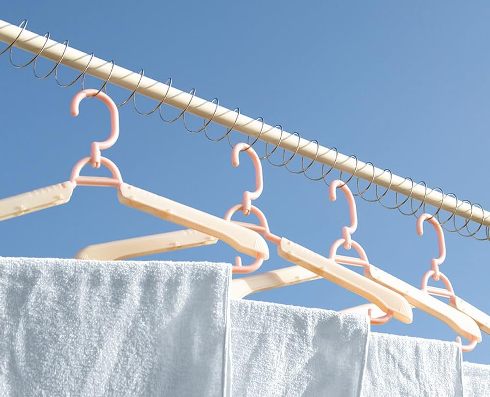 商品紹介 - より ●外で洗濯物を干した時、風が吹いてもハンガーがよらない便利なバネ ●らせん状のリングで中に物干し竿を通して使用する。リングを物干しの長さに合わせて伸ばすと、らせんに間隔があき、その間にハンガーをかけるという仕組み。リングが物干し竿に固定されるため、リングやリングの間にかけたハンガーはずれなくなる。風が吹いてきても洗濯物の間隔が保て、風通りが良くなり効率よく乾かすことができる