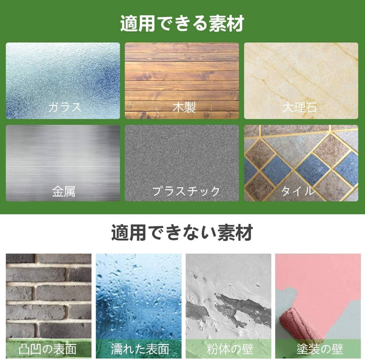 • 対応素材広い&ご利用のヒント、 本両面テープの性能が高くて、幅広く使われていて、平らな地面からザラザラの壁までほぼ対応できます。適用の表面は木製品から、ガラスや金属、タイル、 プラスチックなどにはOKですが、粉塵だらけの壁と壁紙には向いておりませんので、何卒ご了承をお願い致します(壁紙のご利用である場合、もともと紙製なので、外す時には剥がれる可能性がございます。くれぐれもご注意くださいませ)。