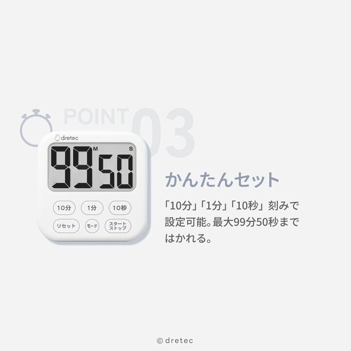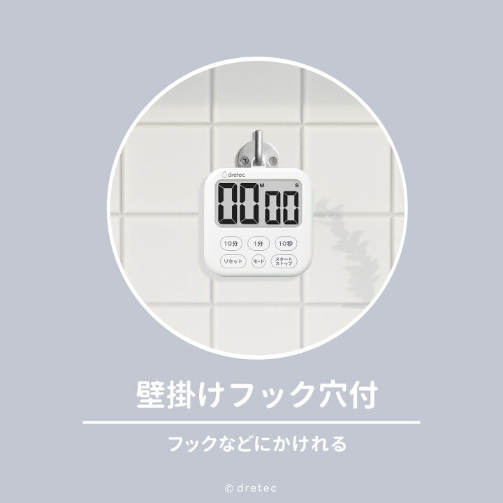 「10分」「1分」「10秒」単位で簡単にセットでき、カウントアップ・カウントダウン機能に加え、繰り返し使える便利なリピート機能も搭載。壁掛けフック穴・スタンド・マグネットの3WAYで設置場所を選ばず使え、家庭用はもちろん業務用としても活躍する多機能タイマーです。