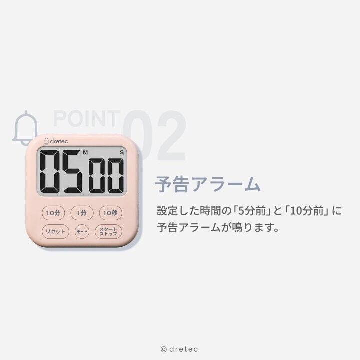 カウントダウン時には「5分前」「10分前」に予告アラームでお知らせしてくれるので、調理や勉強、作業の効率がアップします。