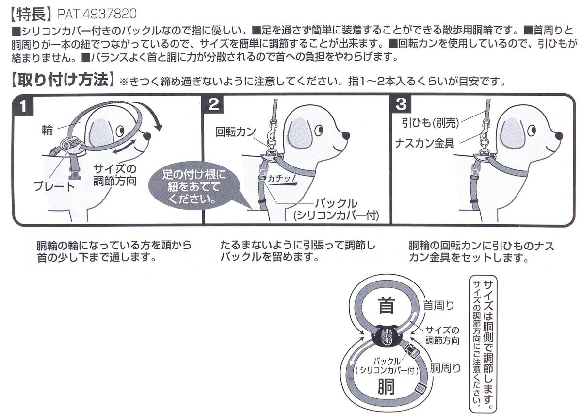 商品紹介 シリコンカバー付きでバックル脱着時に指が痛くない 原材料・成分 ナイロン、シリコン 使用方法 胴輪の輪になってる方を首にかけもう一方を胴に回してとめて下さい。