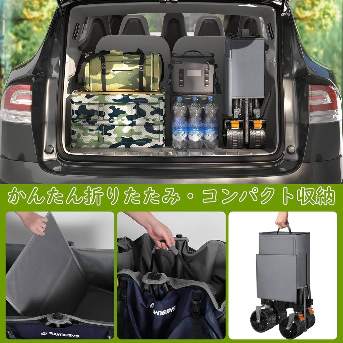 ブルーグレー色 Raynesys キャリーワゴン 特大容量260L 高耐荷重200kg 【長物対応サイトポケット付き】キャンプカート
