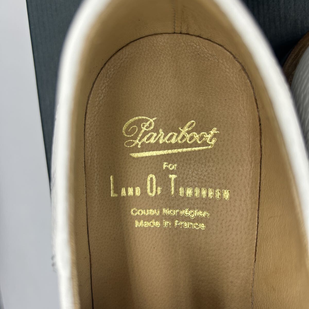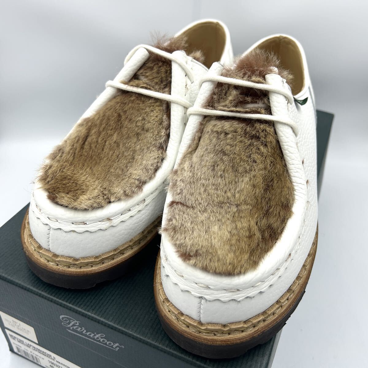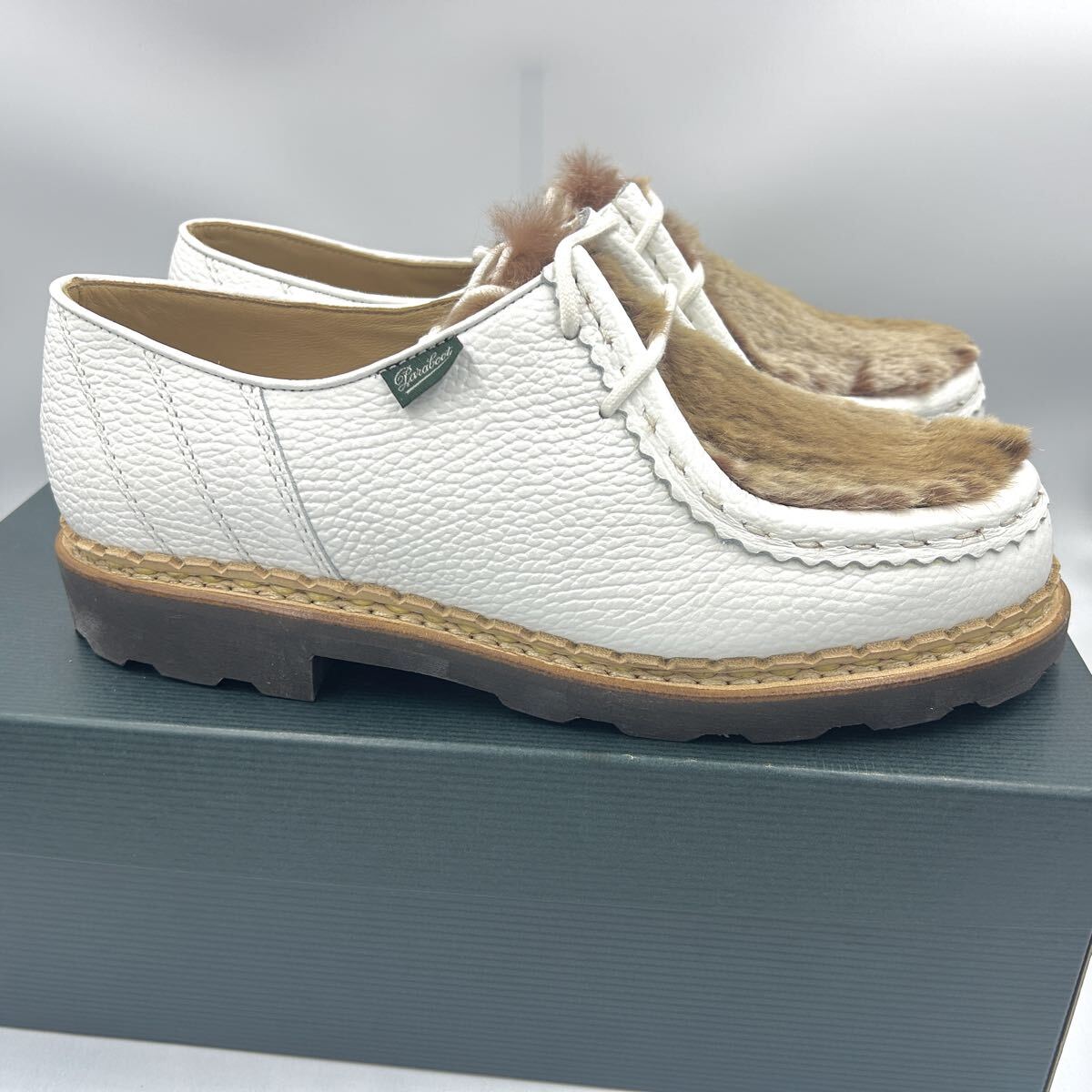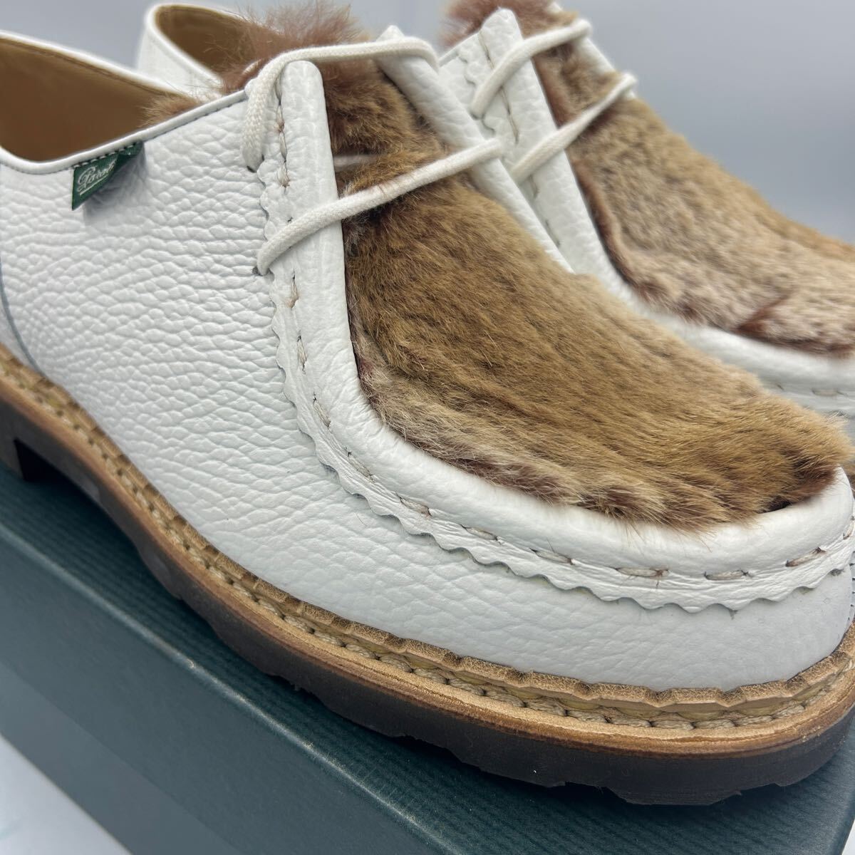 パラブーツのチロリアンシューズ、モジーンです。2021年TomorrowLandが別注したもので、皮革はホワイトのシボ革で、甲にはラパン(ウサギ)のファーがあしらわれています。パラブーツの伝統を感じさせる台形のウエルトなど、パラブーツならではのデザインが詰まっています。