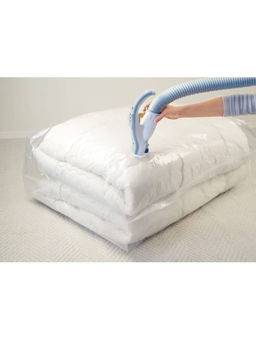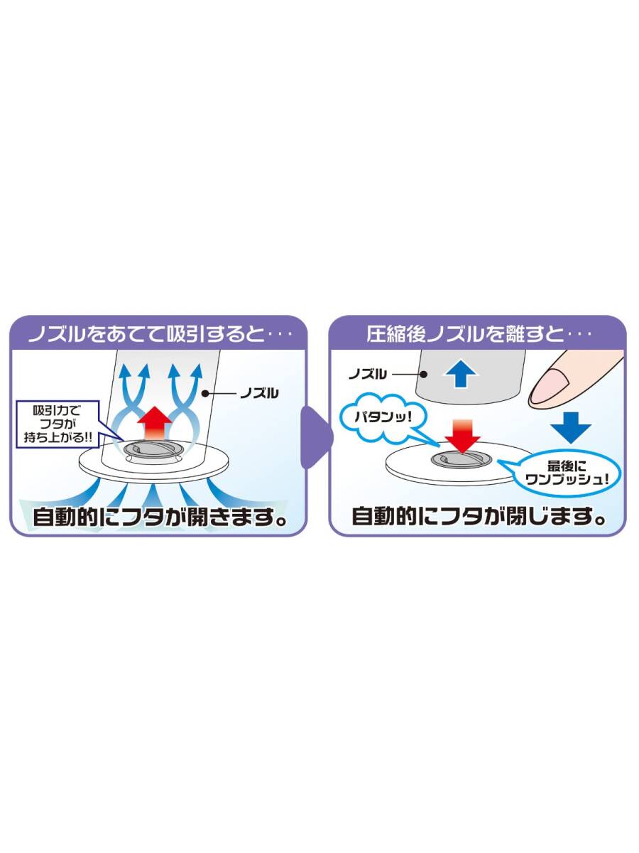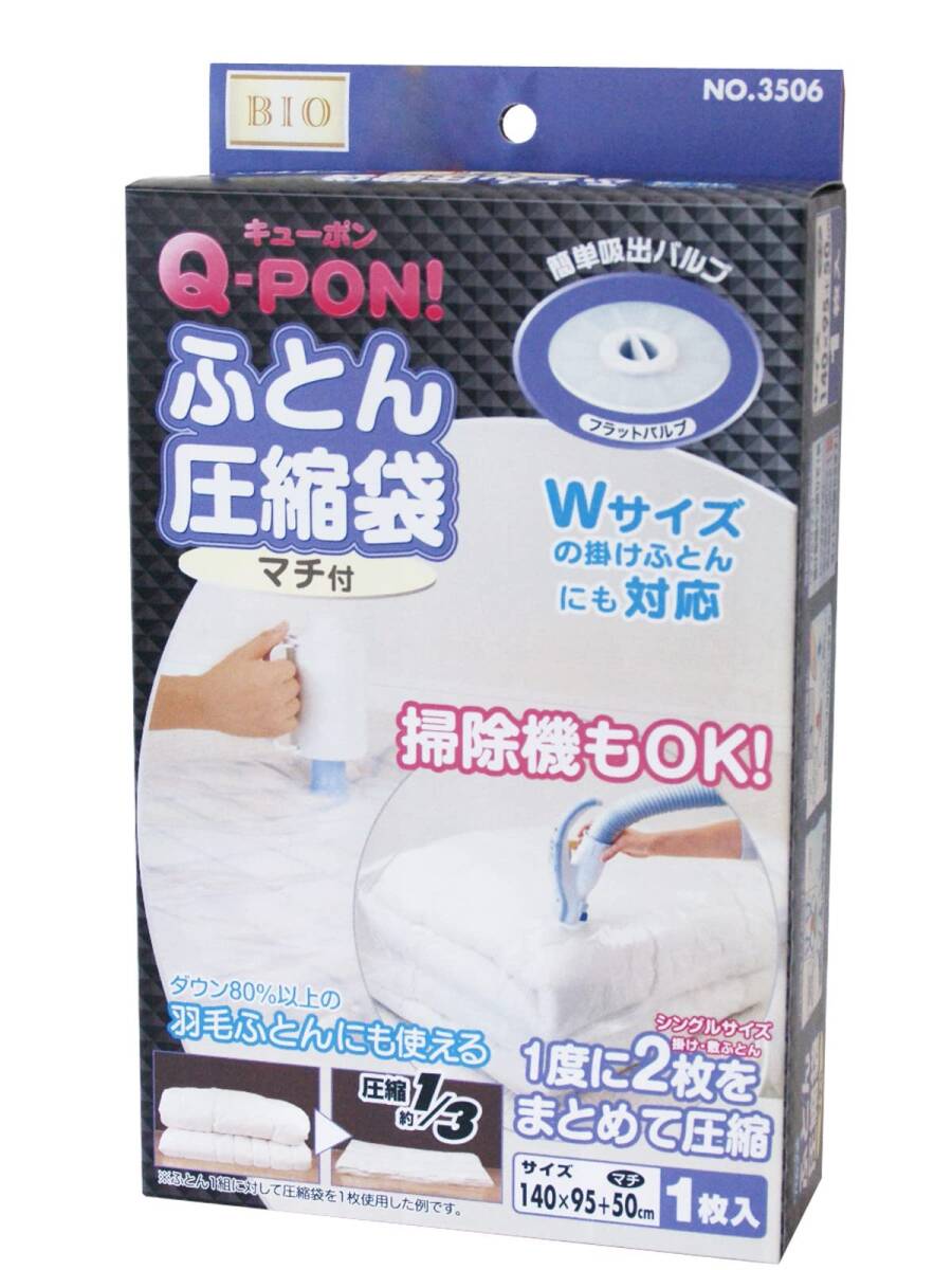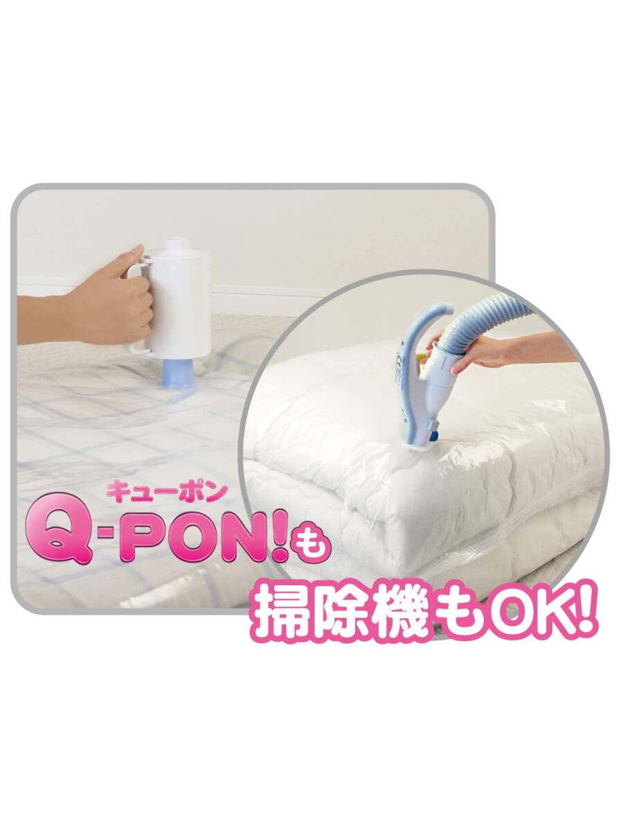 商品紹介 Q-PON!はもちろん掃除機でも使える圧縮袋です。 フラットバルブ式圧縮袋は、空気吸出口に凸部の無い平坦な形状のバルブを採用し、より薄型になったので、圧縮袋を重ねて置いてもかさばりません。 Q-PON!や掃除機での吸引の際は、自動でフタが持ち上がりスピーディーに圧縮開始!吸引後ノズルを離すと自動でフタが閉じますが、最後にフタをワンプッシュして完了!!  空気が逆流せず、簡単に短時間で圧縮できます。 マチ付なのでWサイズの掛けふとん収納に最適! 来客用などのシングル掛け・敷きふとんのセット収納も可能です。 収納の目安 袋1枚にダブルサイズ4つ折り掛けふとん1枚 袋1枚にシングルサイズ4つ折り掛けふとん1枚+3つ折り敷きふとん1枚 セットで収納できます! より ●電動ポンプQ-PON!用のふとん圧縮袋。Wサイズの掛ふとんにも対応、シングルサイズなら掛敷セットで圧縮可能、掃除機でも使用できる ●ダウン80%以上の羽毛ふとんにも使え、開口120cmでふとんが入れやすくなっている ●がさばる羽毛ふとんなども約1/3に圧縮できて押入れにすっきり収納できる