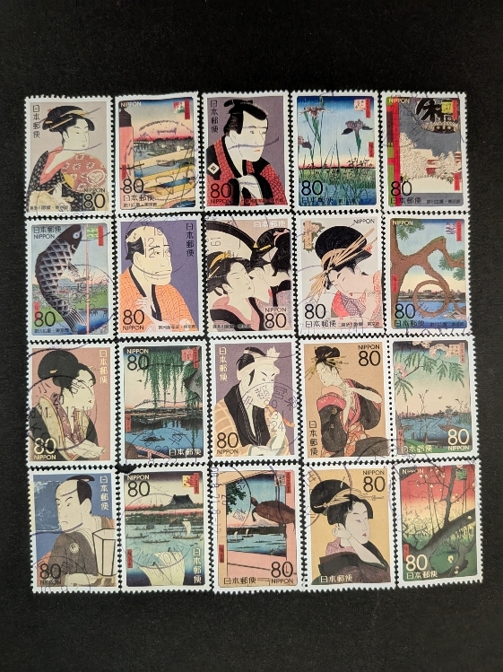 使用済み切手「江戸名所と粋の浮世絵 第1集・第2集」 20種完 20枚です。