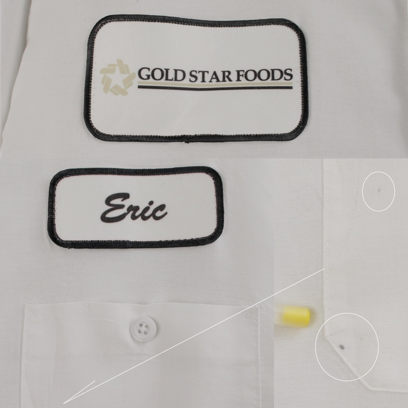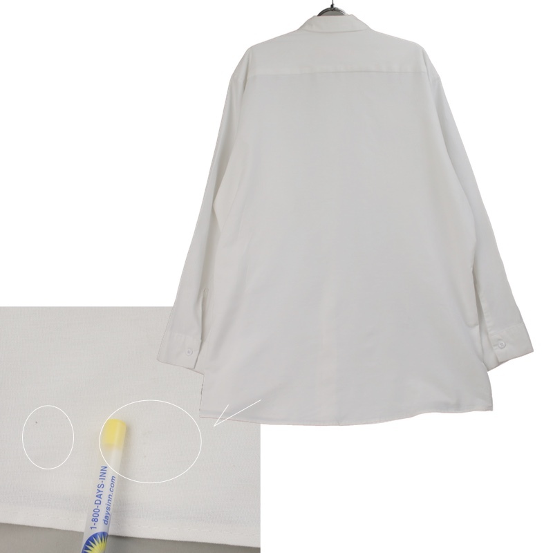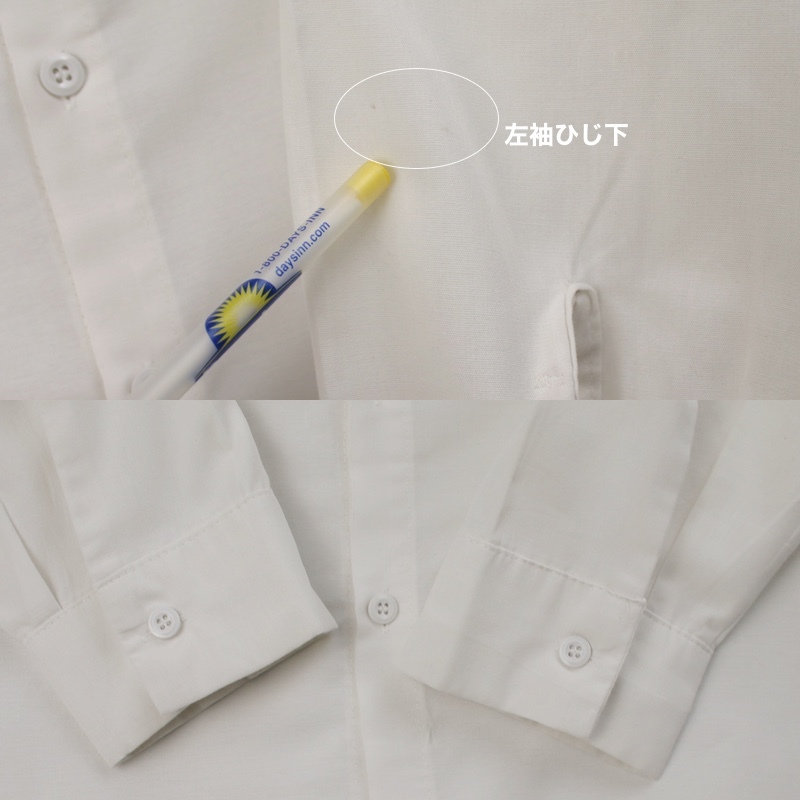 左襟先周り、左胸ポケットにペン刺しのインク点シミ、左袖ひじ下、袖口、後ろ側の左すそなど、目立たない程度の細かなシミが散見されます。