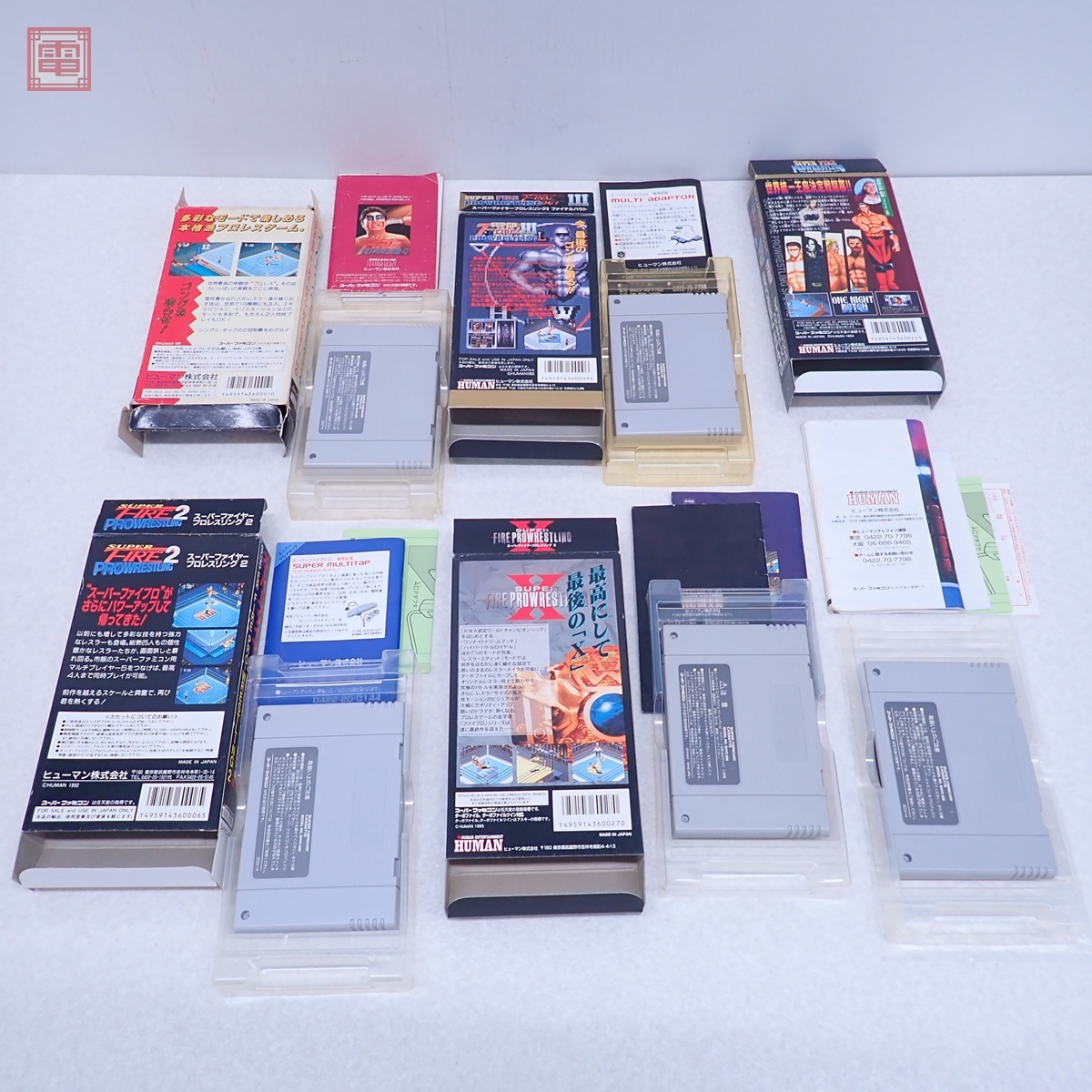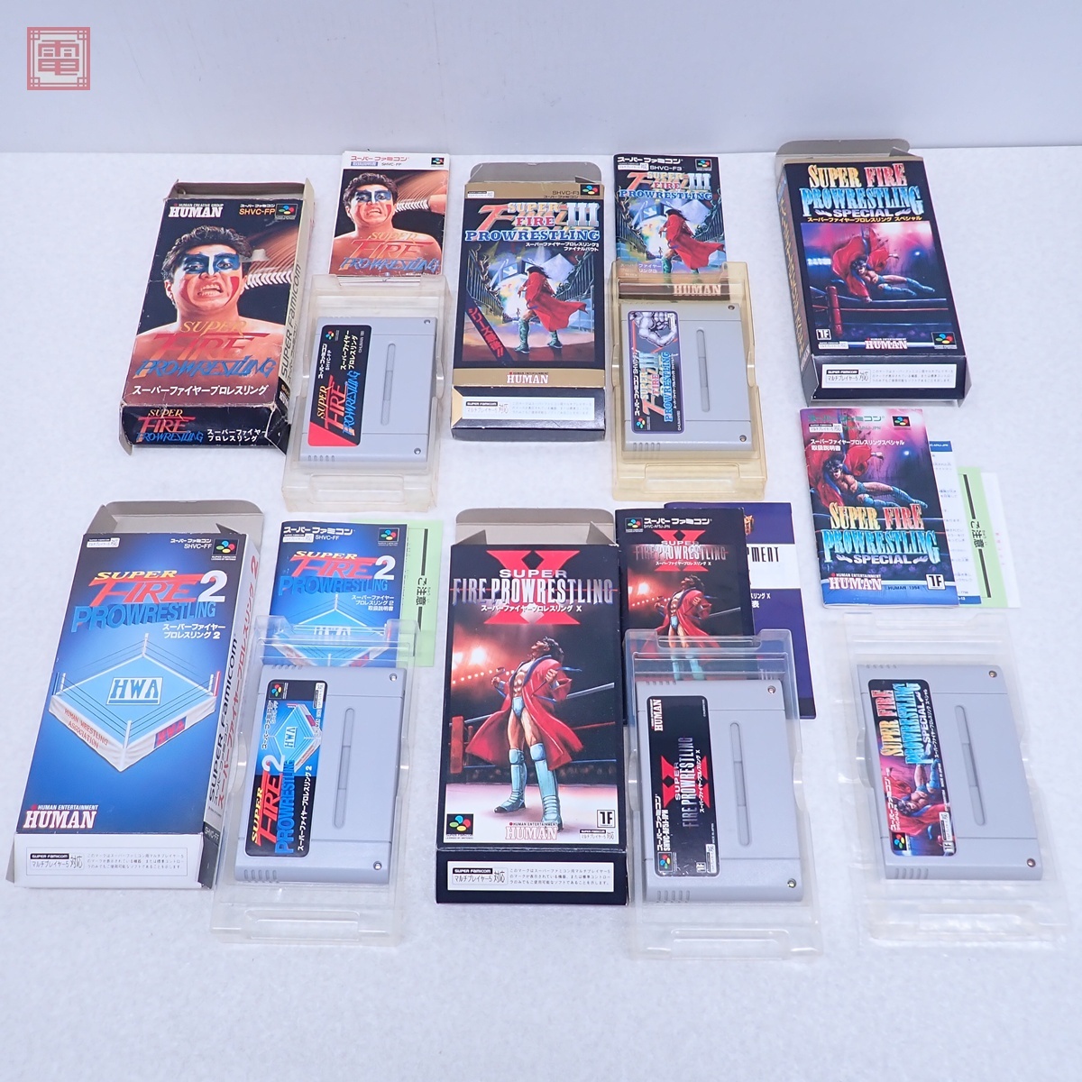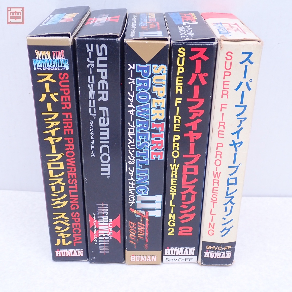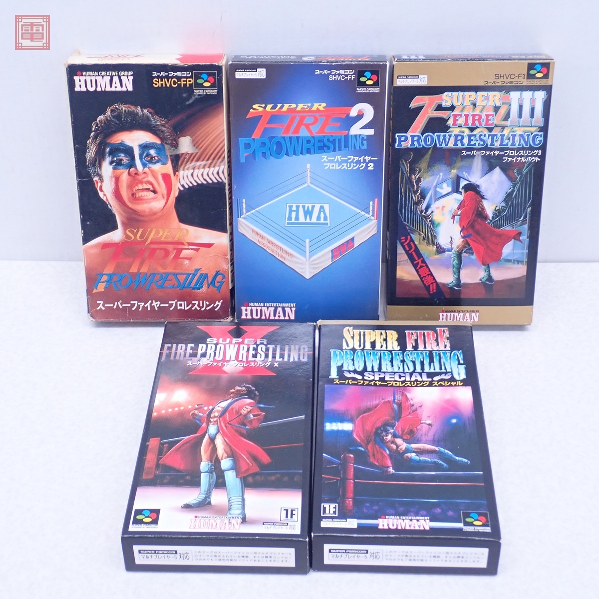 動作保証品 SFC スーファミ スーパーファイヤープロレスリング/2/3/X/スペシャル まとめて 5本セット HUMAN 箱説付 ダブりなし こちらの商品は動作保証品となりますので、一週間の動作保証をお付けします。 ■箱にスレ、角スレ、汚れ、イタミ、シワ、シミ、ヤケ、黄ばみ、キズ、破れがあります。 ■取扱説明書にスレ、角スレ、汚れ、シワ、シミ、ヤケ、黄ばみ、折れ、キズ、ホチキス部のサビがあります。 ■カセットにスレ、キズ、汚れ、ヤケ、黄ばみがあります。 ■内プラケースにスレ、キズ、汚れ、黄ばみ、割れ、へこみがあります。 ■上記以外は未チェックです。 ■写真のものが全てです。付属物の有無や状態については写真からご判断ください。 ■チェックに使用したモニターやチェック機器等は、特に表記がない限りは付属いたしません。 ■商品到着後、当店の保証期間中は、商品及び箱や取説、付属品などを1つでも廃棄や破損をしないようにお願い致します。廃棄や破損をした場合、商品に問題があった場合でも対応や返金などの対処ができなくなります。 | |||
