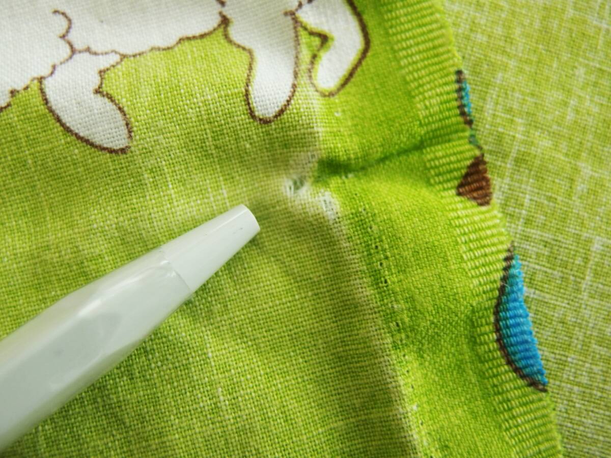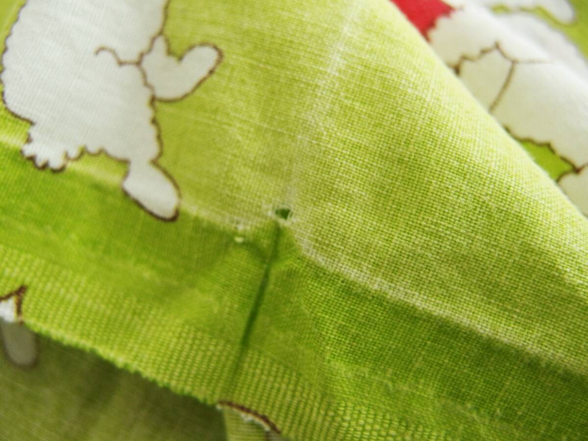 折り目に近い場所とそうでない場所に色あせの差(ムラ)が多少見られます。小さな穴と小さな薄いシミが1個ずつあり。総合的に見て、使用感はあるものの、まだまだお使いいただける状態です。