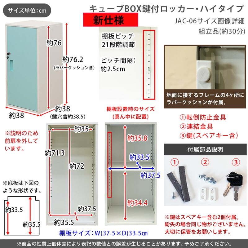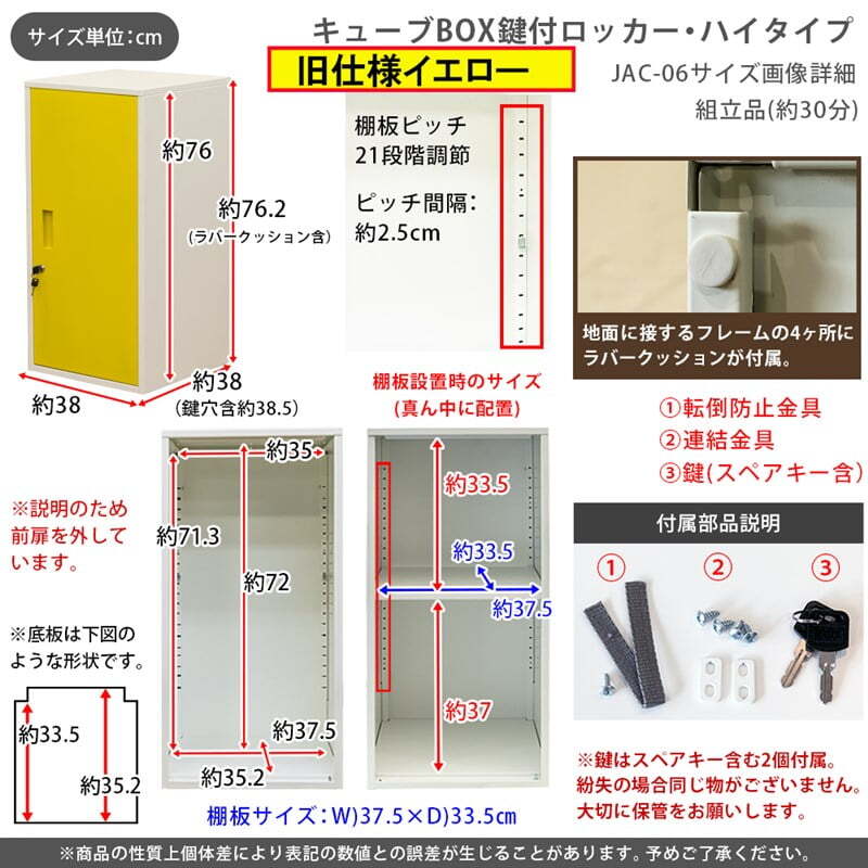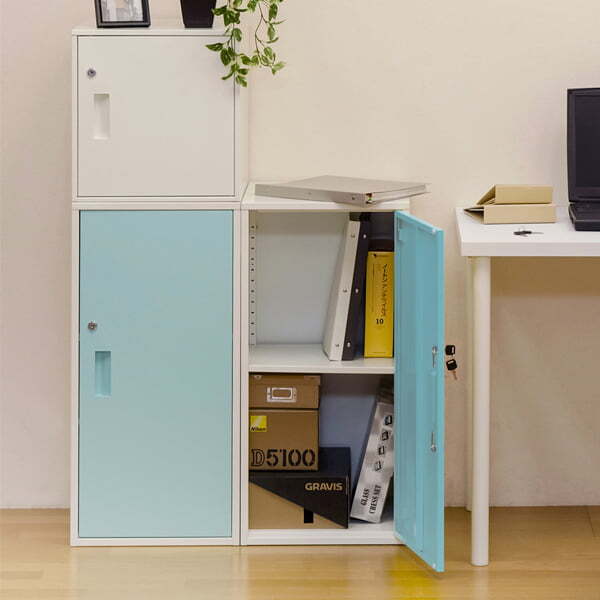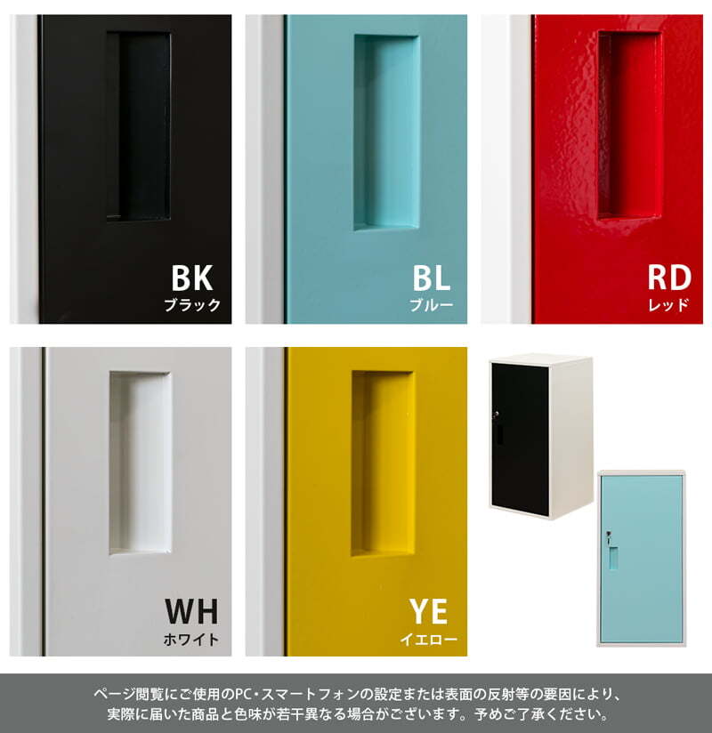 ※現在ご覧の商品ページはブルーのご購入ページとなります。 ヤフオクの仕様上単一ページに複数バリエーションを掲載することができませんので、他バリエーションが希望の場合は別ページでご購入お願い致します。 配達業者を指定いただくことはできません。 沖縄県・離島配送不可となります。 キューブBOX 鍵付きロッカー ハイタイプです 鍵付扉でロッカーとして貴重品の保管も可能なスチール製のキューブBOX ハイタイプです 棚板は外してもお使いいただけます(21段階調節可能、約2.5cmピッチ) 鍵の番号はBOXごとに全て異なる為、オフィス等でご使用頂く際も安心です (複数台お買い上げいただいた場合、鍵が重なることはほとんどございませんがもし重複してしまっている場合は、早急に交換致します。※鍵に記載されている番号をご連絡ください。扉ごとの交換になります。) タイミングによっては在庫切れの場合があります。 【鍵はスペアキーを含め2個付属しています。同じ鍵はありませんので紛失してしまうと開けられません】 転倒防止金具も付属し、安心してお使いいただけます ※(壁側に取り付ける為のネジは、お住まいの環境で異なる為付属していません。お客様でご用意お願いします) 扉の色、ブラック(BK)、ブルー(BL)、レッド(RD)、ホワイト(WH)、イエロー(YE)の5色展開です