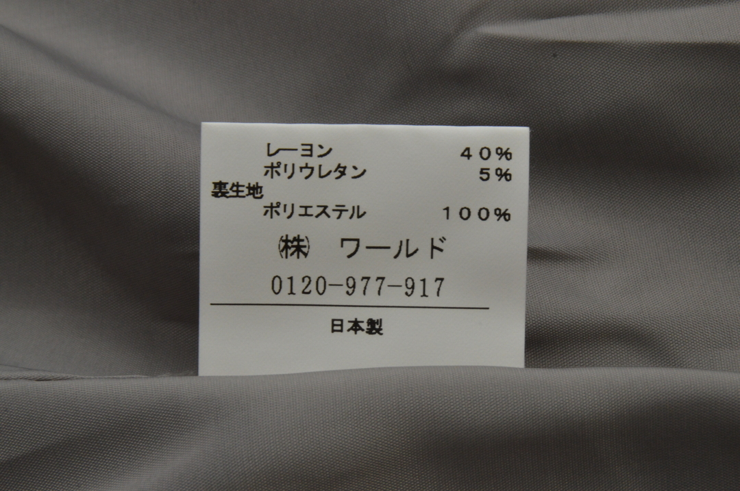 | (表地)ポリエステル:55% レーヨン:40% ポリウレタン:5% (裏地)ポリエステル:100%  | |||||||||||||