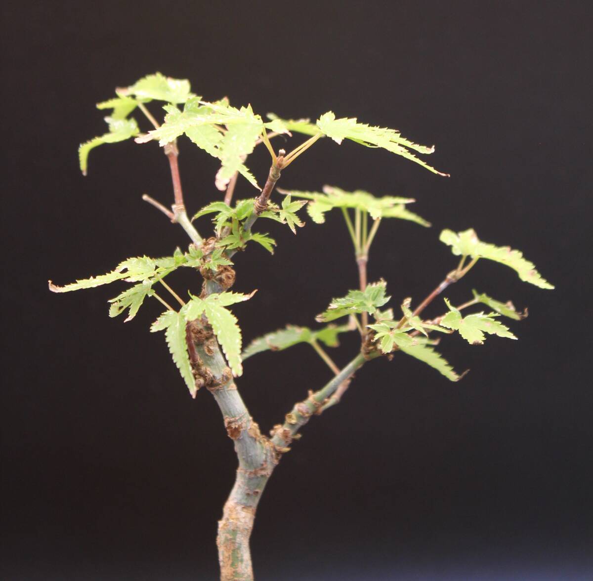 本品はトウカエデ(Acer buergerianum)のミニ盆栽で、繊細な葉と自然な樹形が魅力です。幹の曲がりや枝ぶりが美しく、今後の剪定・仕立ても楽しめる一品です。