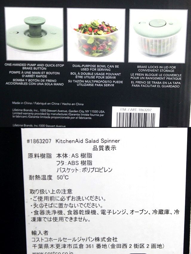 商品説明 | ご覧頂きありがとうございます。 こちらの商品は【kitchenAid キッチンエイド サラダスピナー 水切り キッチンツール ピスタチオ★格安出品★】になります。 新品未使用品になります。 ・元箱には若干のイタミがございます。 (写真参照) 何卒ご理解くださいませ。 ・写真撮影時はホワイトグローブを着用にて行いました。 ご安心くださいませ。 万が一、落札者様のお手元に届き不備不具合等がございましたら、返品対応をさせて頂きますのでどうぞご安心くださいませ。m(--)m (返品対応期間は商品到着1ヶ月間とさせて頂きます) 内容及び状態は写真をご覧くださいませ。m(--)m 出品は・・・写真アップされている物が全てになります。 ≪商品説明≫ キッチンエイドのサラダスピナーを使えば、サラダ菜、果物、野菜をすばやく簡単に洗浄し、乾燥させることができます。 レタスのシャキシャキ感を保ちながら洗えます。ソフトタッチのポンプ機構とブレーキボタンで、片手で快適に操作できます。 ロックはポンプ機構をフタに固定し、ピースはキャビネットや引き出しに簡単に収納できるように入れ子になります。 ボウルの底には滑り止めが付いており、サラダスピナーを所定の位置に保ち、カウンターを傷つけません。 バスケットはザルとして、ボウルはサラダの盛り付けにお使いください。 サイズ:27 x 27 x 18cm 重量:1.22kg 素材:ABS樹脂、PP、TPE、SAN 原産国:中国 ブランド:KitchenAid どうぞご入札のご検討を宜しくお願い致します。 m(--)m m(--)m m(--)m m(--)m ≪気持ちよくスムーズな御取引ができるよう努めて参ります≫ ★コチラの商品発送につきましては≪ゆうパック≫のみとさせて頂きます。 ~サイズ80~ (ゆうパックには保証及び追跡番号有り) ゆうパック 料金表は・・・・・コチラ をクリックしてくださいませ。 元箱商品をプチプチにて包み包装紙を巻いて発送をさせて頂きます。 どうぞ ご入札のご検討を宜しくお願い致します。m(--)m どうぞ ご入札のご検討を宜しくお願い致します。m(--)m ≪気持ちよくスムーズな御取引ができるよう努めて参ります≫ ★商品画像はPCや環境の違いにより現物とは若干色合いが違う場合もございますので予めご了承ください。 ★神経質な方のご入札はご遠慮くださいませ。 ★他にも楽しいアイテム等を格安出品致しております。 宜しければご覧くださいませ。 ☆チャント梱包して発送致します。 No.5470 |