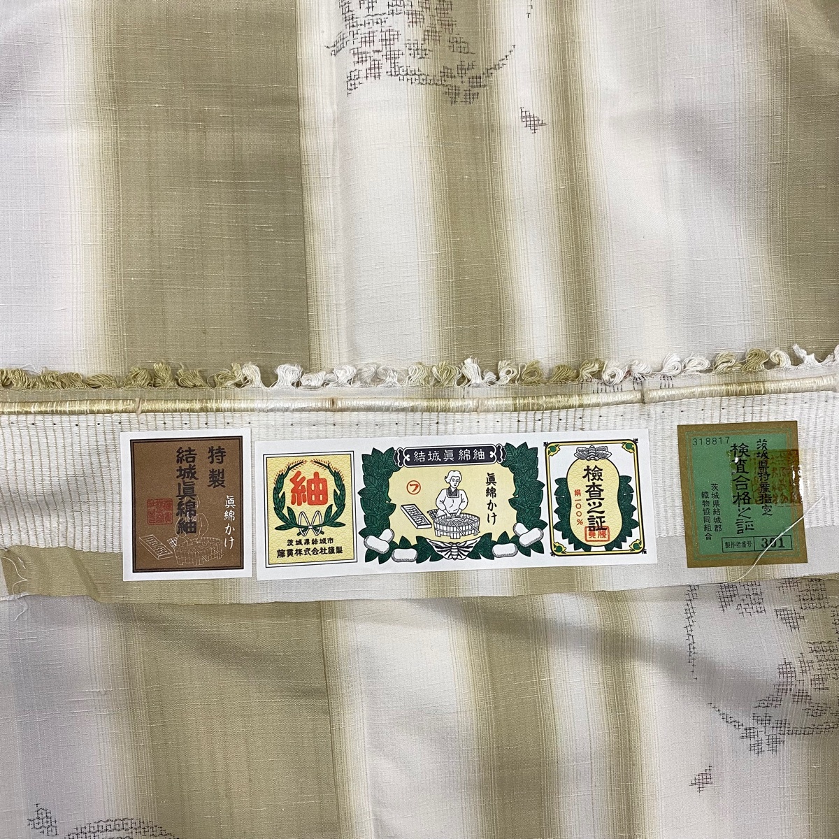 | 紬 美品 秀品 証紙 やまと 花丸文 縦縞 薄茶色 袷 身丈158 裄丈63.5 S 正絹 【中古】 |