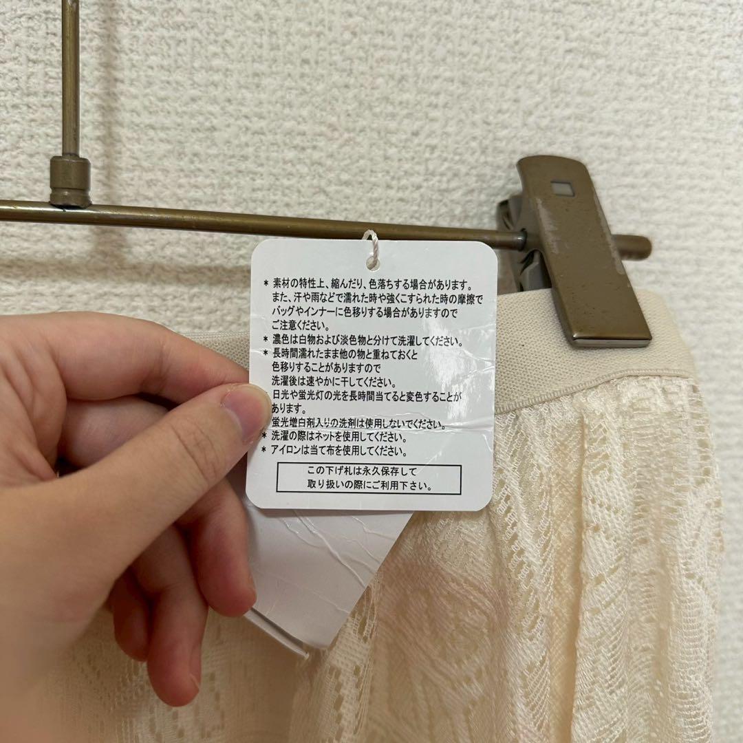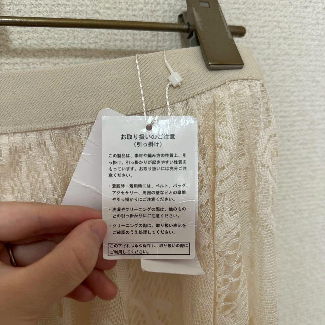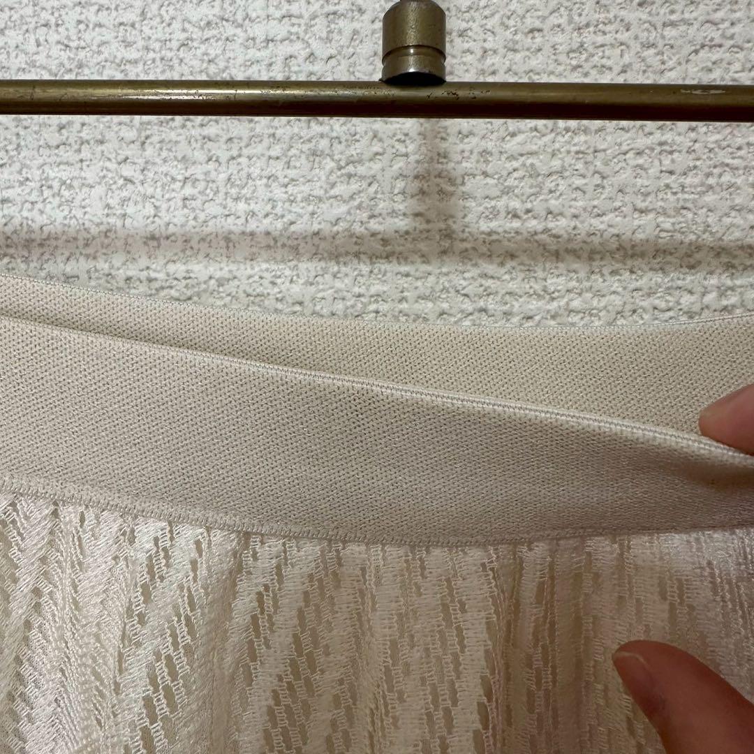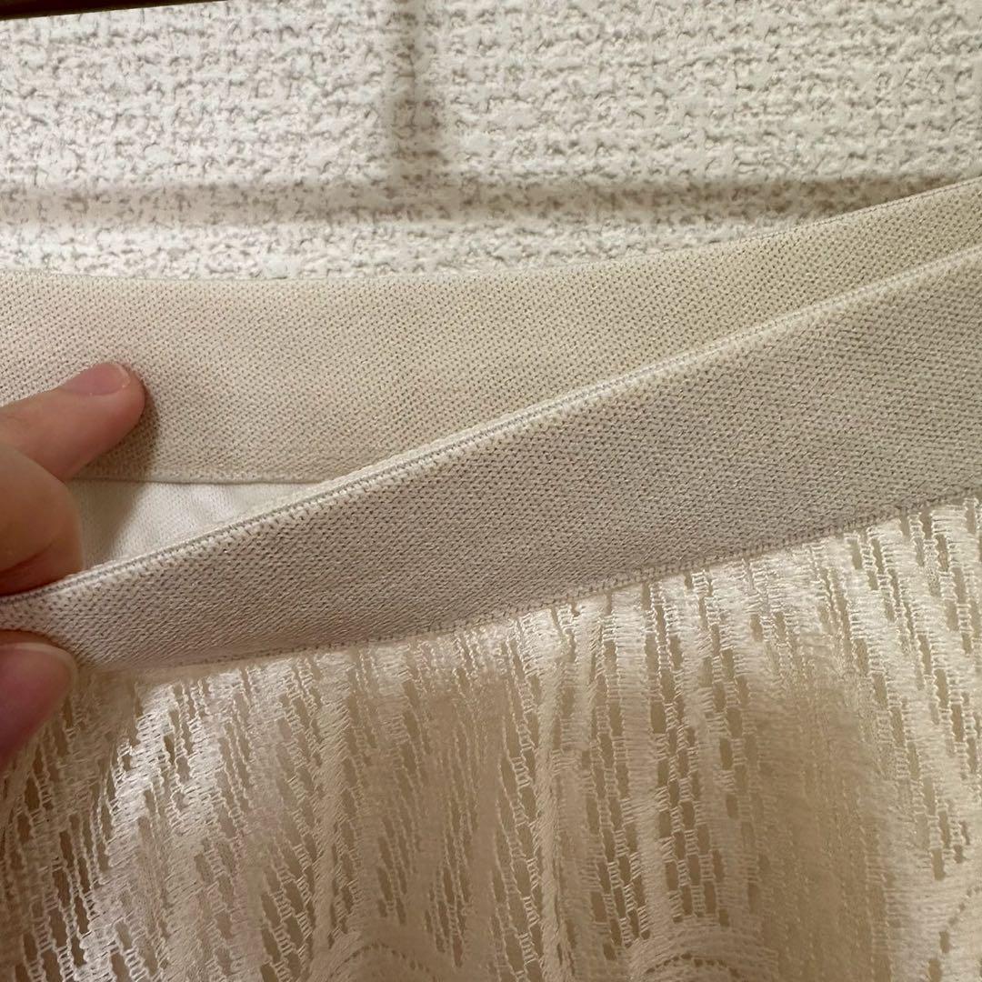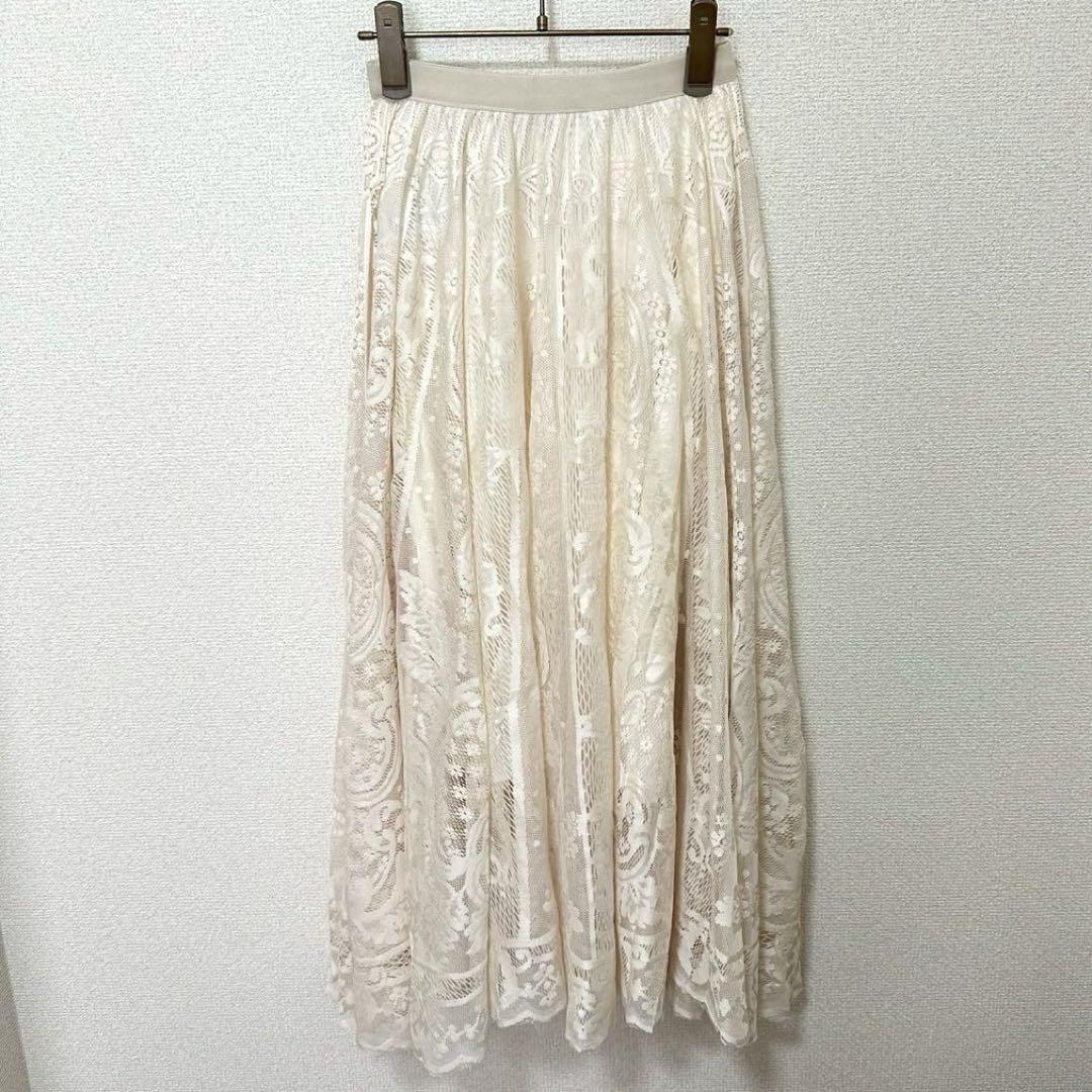 アイボリーのレースロングスカート、ゴムウエストで快適な着心地。