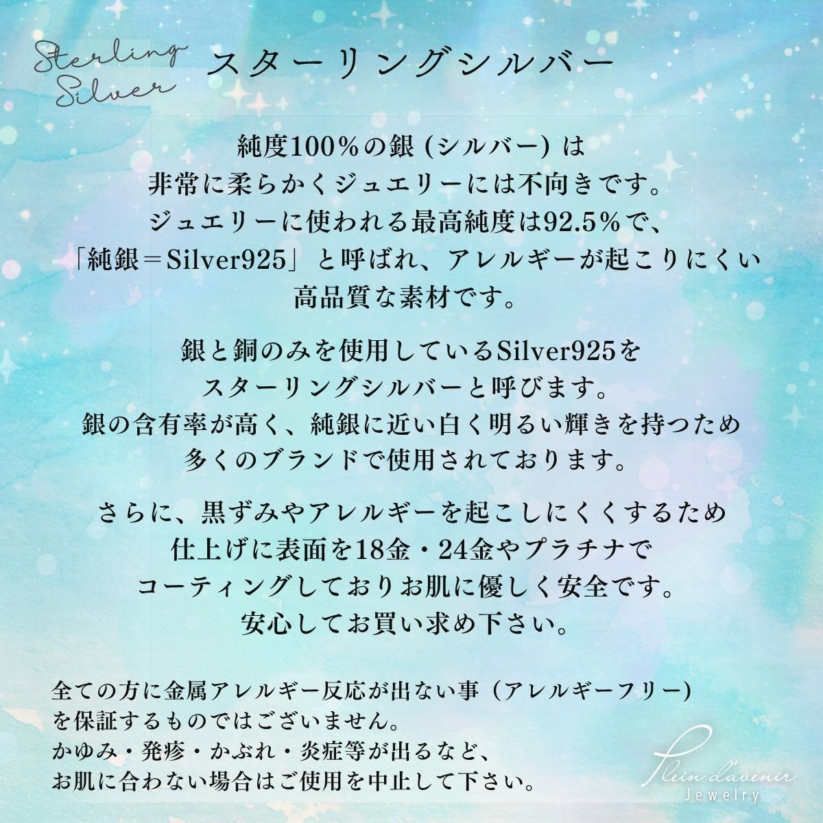 当ショップ商品の多くは、Silver925を使用しております。 お肌に優しく、金属アレルギーの方にも安心してご使用いただける素材です。美しい輝きと耐久性を兼ね備えた素材でありながら、お手入れが簡単です。 ◆全ての方に金属アレルギー反応が出ない事(アレルギーフリー)を保証するものではございません。予めご了承ください。 ◆かゆみ・発疹・かぶれ・炎症等が出るなど、お肌に合わない場合はご使用を中止して下さい。