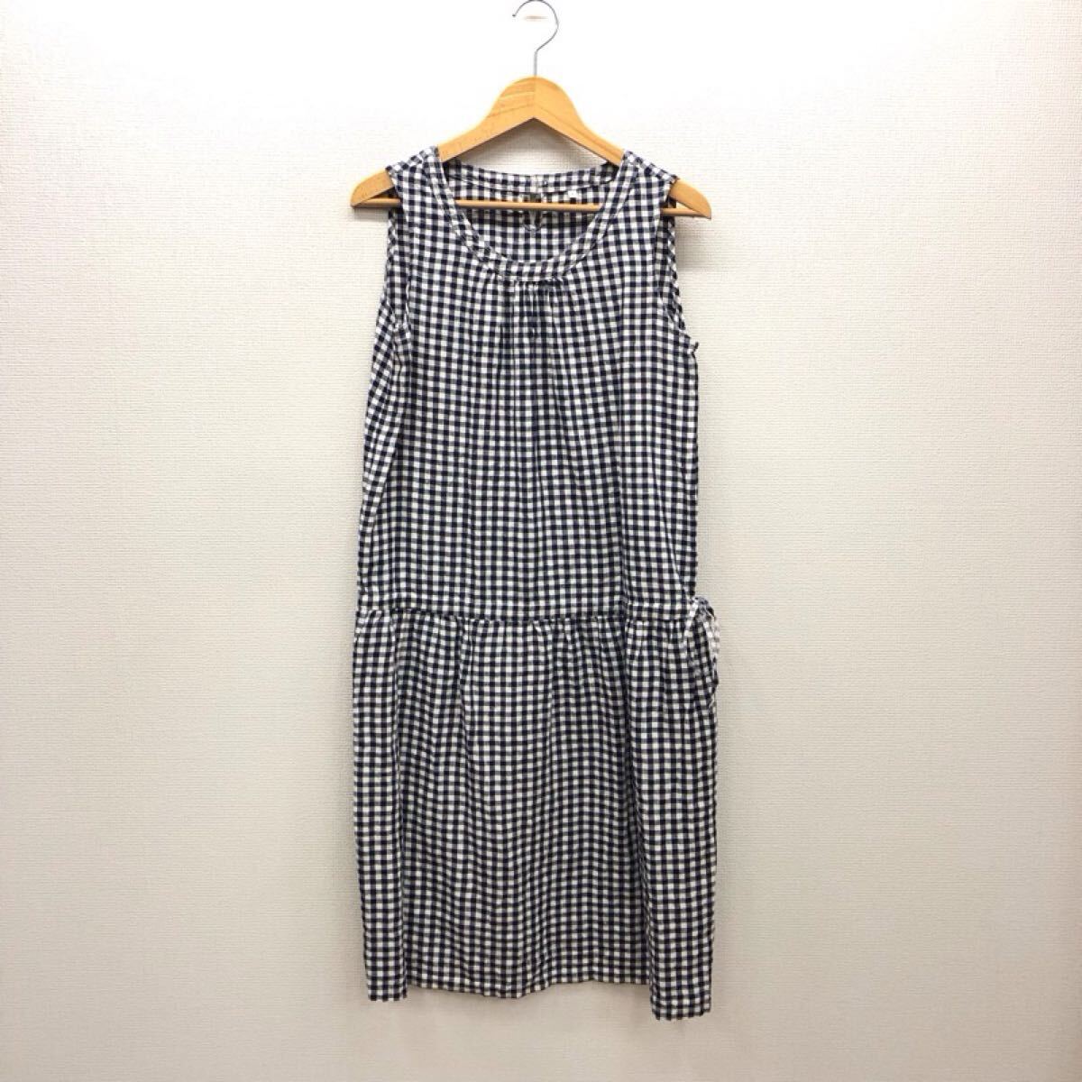 【む049】無印良品 チェック柄リネンワンピース Lサイズ ネイビー ノースリーブ 膝下丈 薄地 麻100% ブランド古着 送料無料