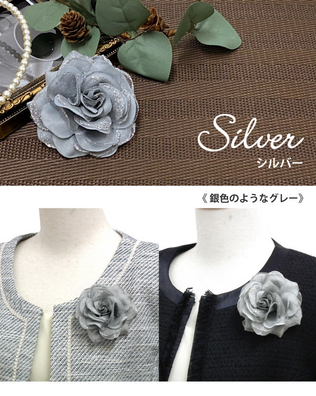 オーガンジーとラメのコサージュです。ゴージャスな花びらでボリュームがありとても綺麗! |