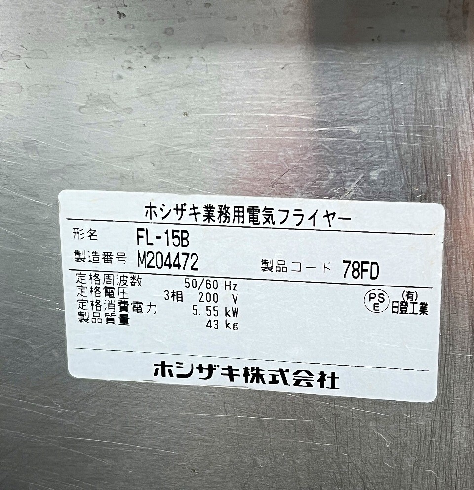 | 製品名 AA-114 業務用 ホシザキ 電気フライヤー FL-15B 2022年製 3相200V W350×D600×H800(920) 店舗用品 中古 厨房 |
