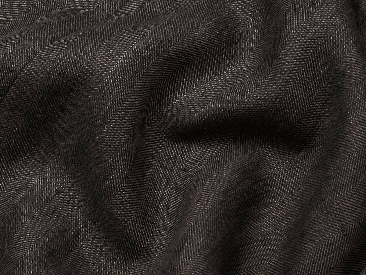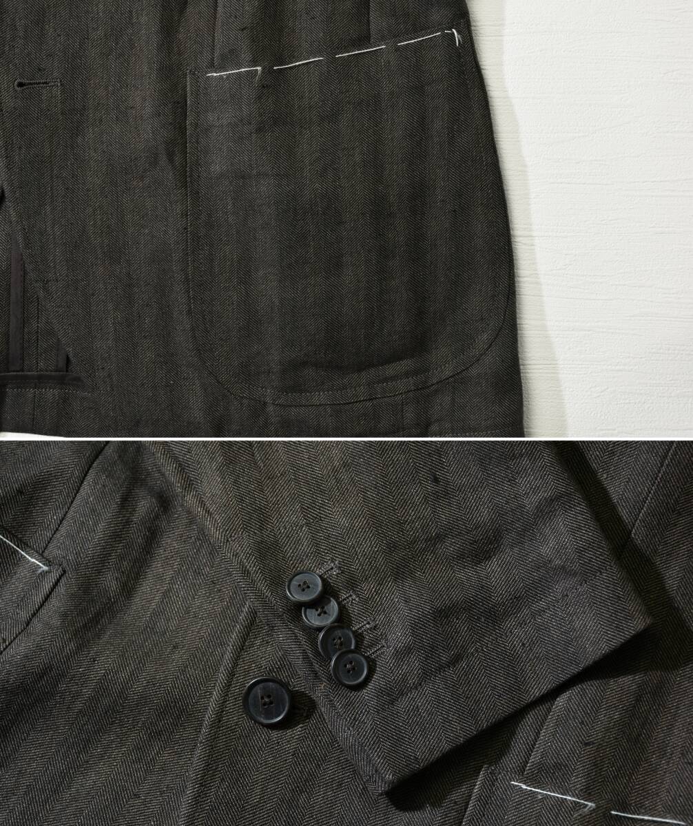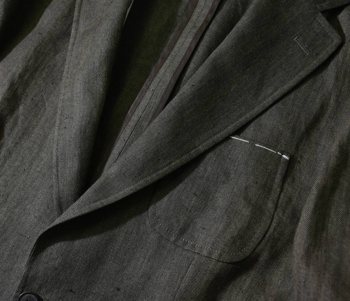 このジャケットには、夏にうってつけのリネンファブリックが使用されています。 原料になっているのは、トップクオリティのリネン素材(亜麻科の一年草フラックス、いわゆるアイリッシュリネン)です。 これを潤紡(じゅんぼう)と呼ばれる特殊紡績によって素材の持ち味を損なうことなく毛羽立ちの少ない細糸に加工し、 糸に負荷がかからないよう低速で織り上げた春夏用のクラシックな織物“ヘリンボーン”になります、