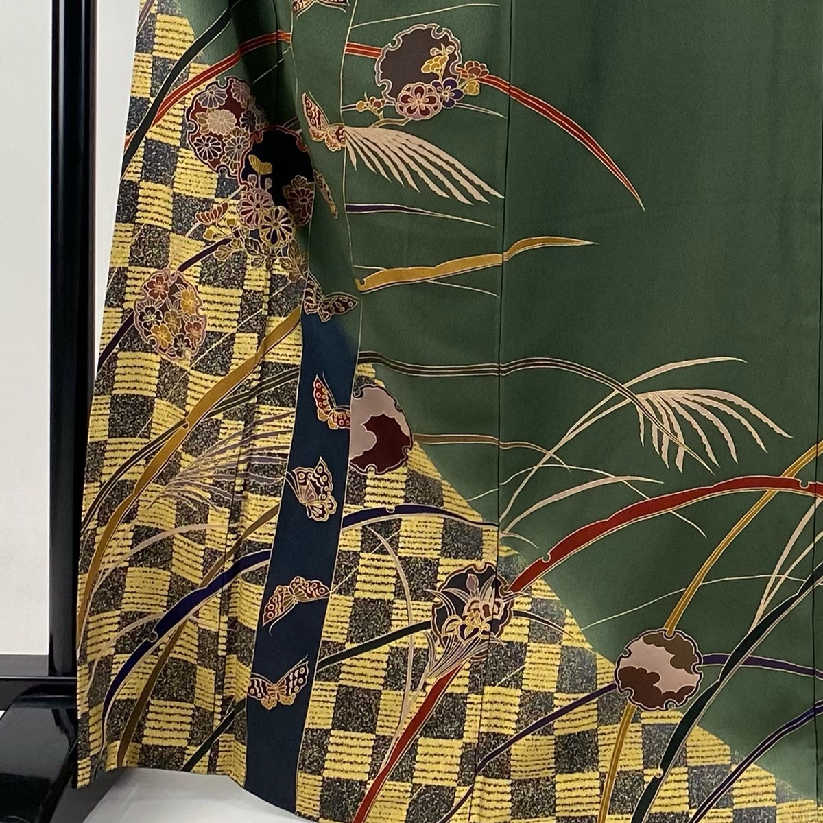 | 訪問着 秀品 雪輪 蝶 金彩 ぼかし 深緑 袷 身丈166 裄丈65 M 正絹 【中古】 |
