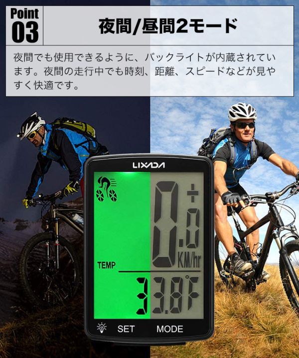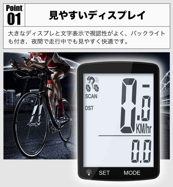 夜間でも使用できるように、バックライトが内蔵されています。夜間の走行中でも時刻、距離、スピードなどが見やすく快適です。