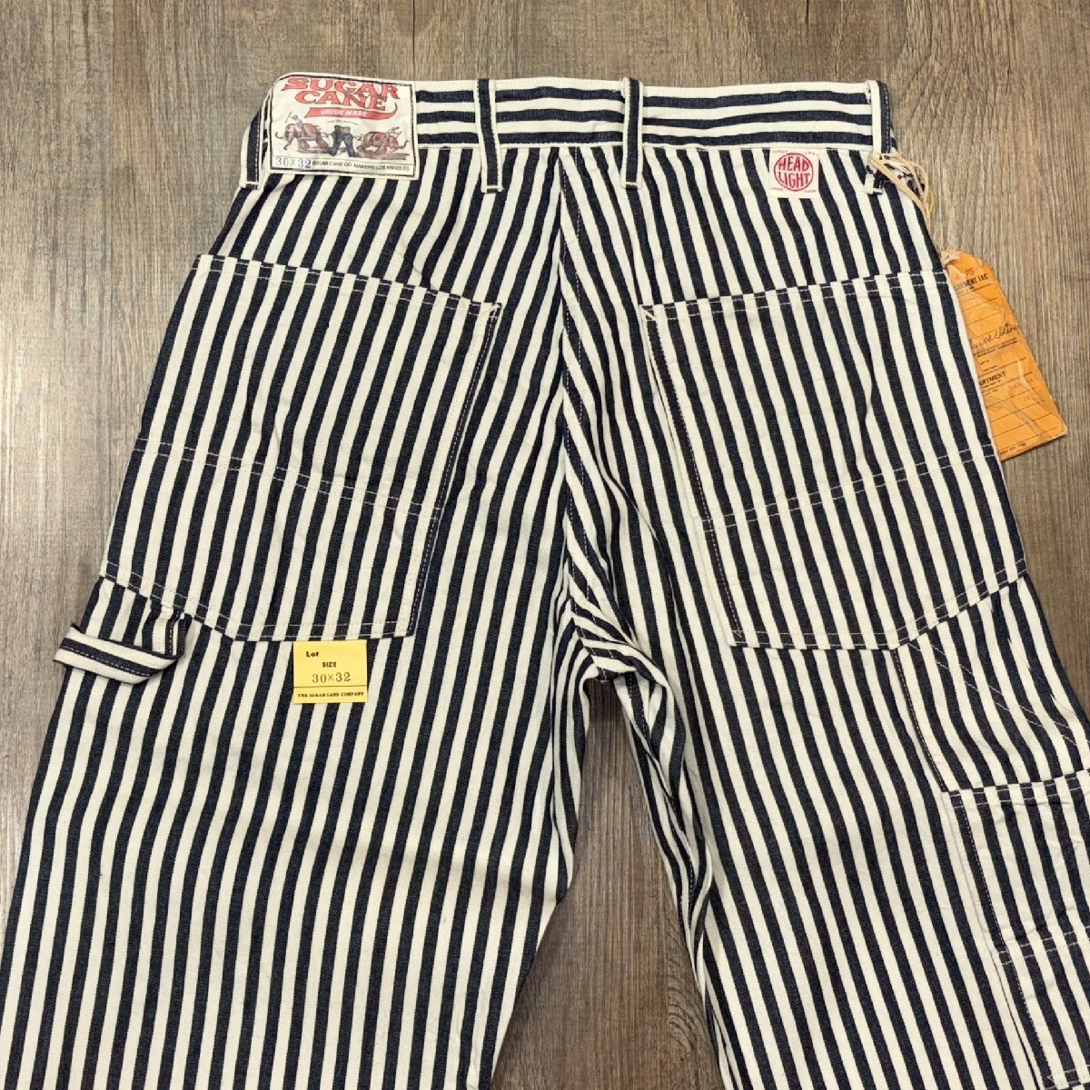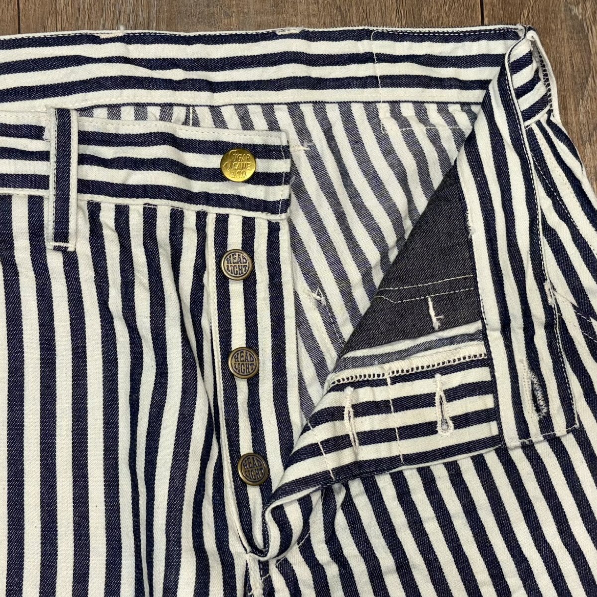 シュガーケーンとヘッドライトのダブルネームで製作されたワークウェア。今回は1930~40年代のヘッドライトのカジュアルライン「HEADIES」の極太ストライプのセーラーパンツ (Lot No.215)がベース。7オンスの1/2インチ巾や1/4インチ巾のインディゴストライプ生地はNOSで、ミスターフリーダムより入手して日本で縫製している。