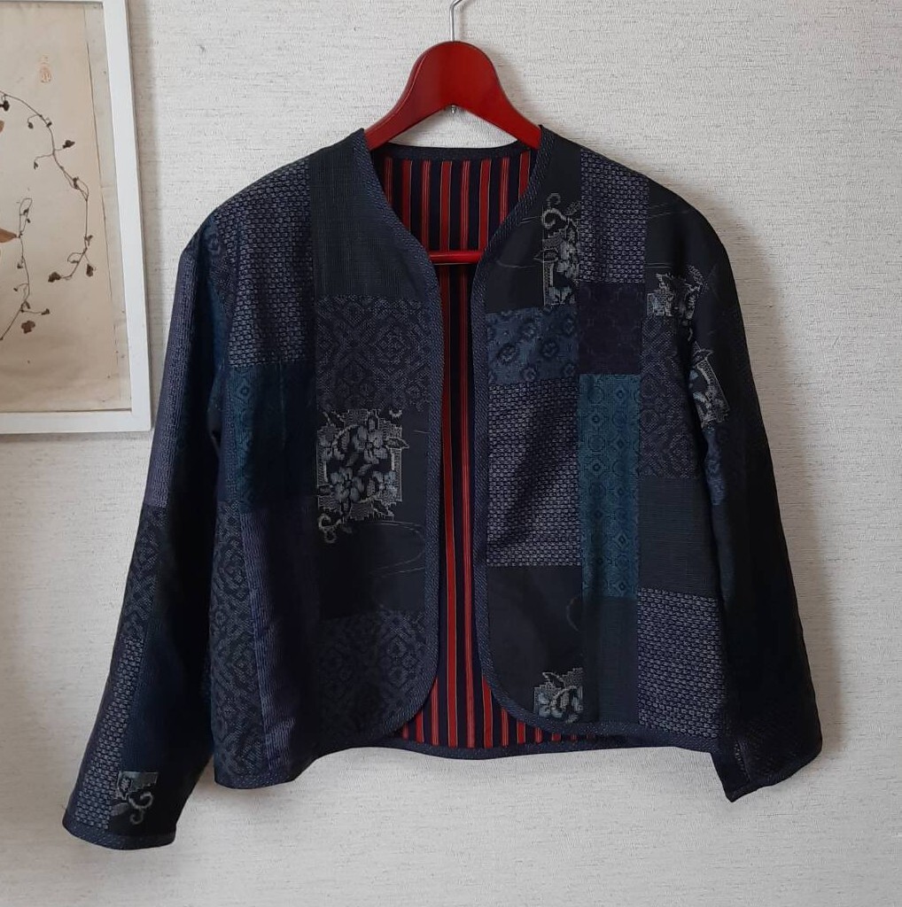 大島紬色々接ぎ合わせてジャケットを製作しました。