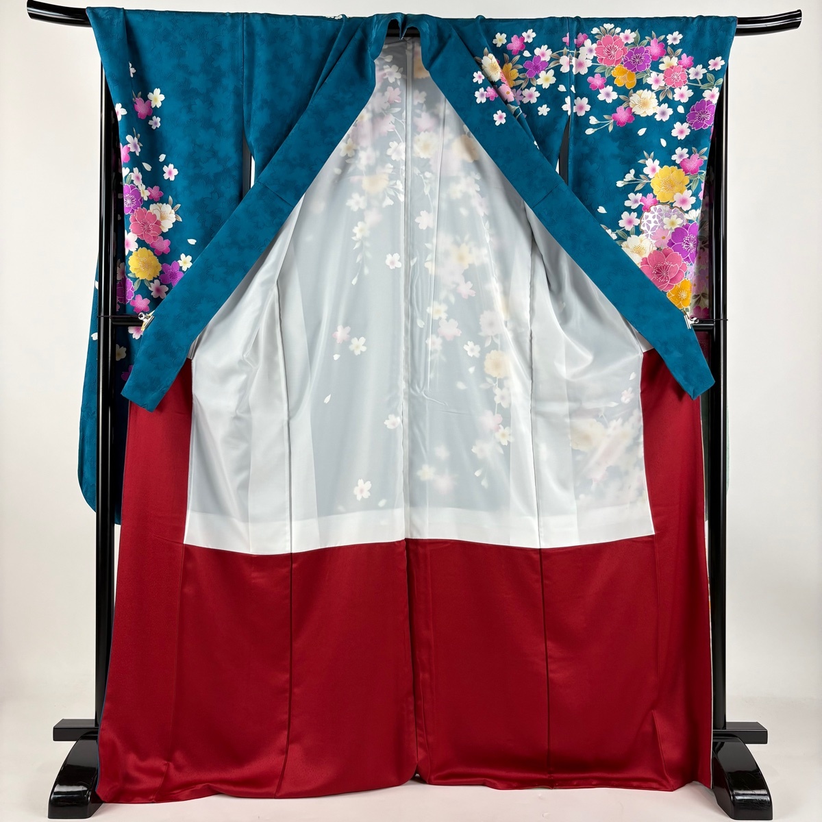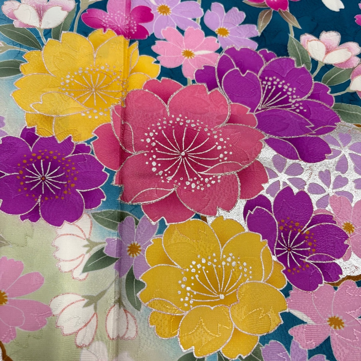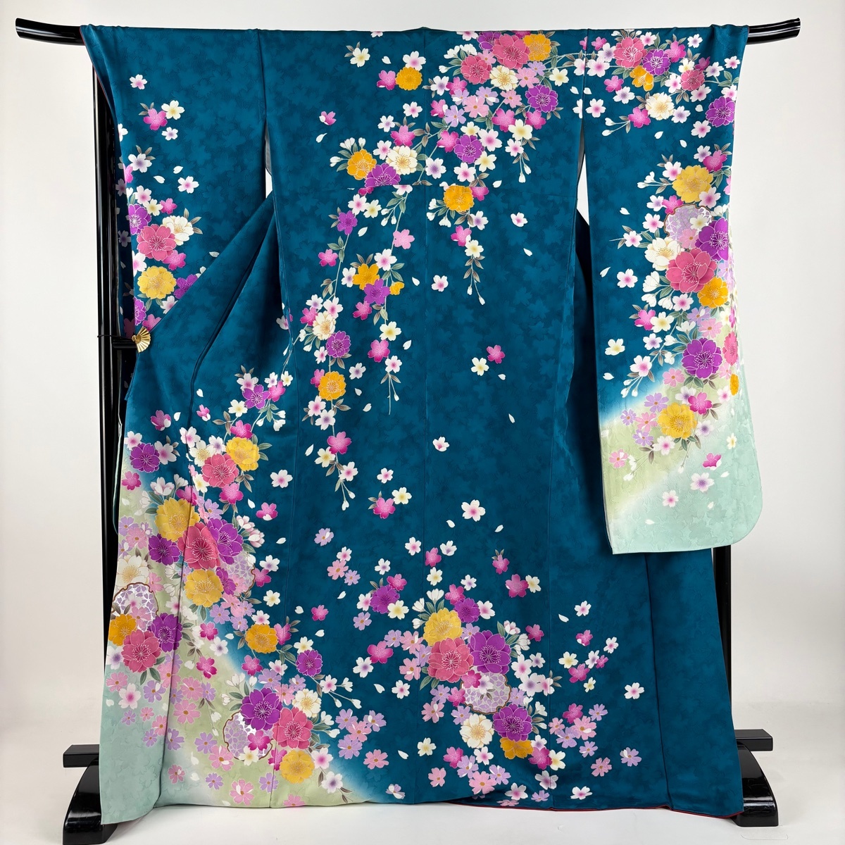 | 振袖 名品 桜 雪輪 銀彩 ぼかし 青緑 袷 身丈170.5 裄丈71.5 L 正絹 【中古】 |
