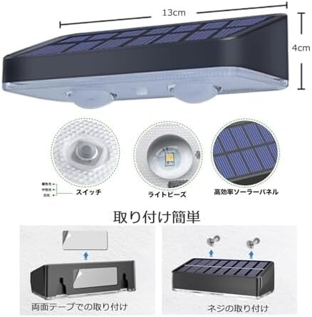 【取り付け簡単&幅広い用途】本ガッテンライトは、付属のネジや両面テープで取り付け簡単、さまざまな場所に設置することができます。配線やバッテリーを購入する必要はありません。様々なシーンでも設置可能。(ご注意:直射日光が当たる場所に設置してください。明るい場所でもベランダなどの軒下や日陰の場所ではうまく充電ができませんので、ご了承ください。)