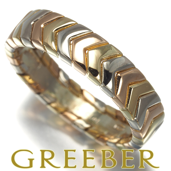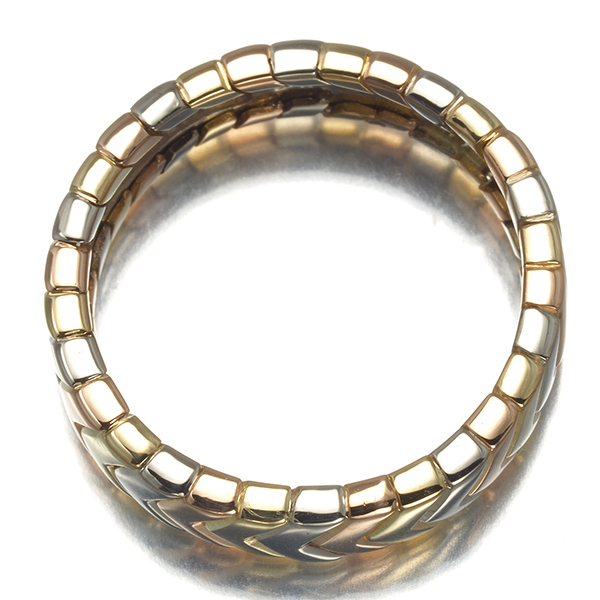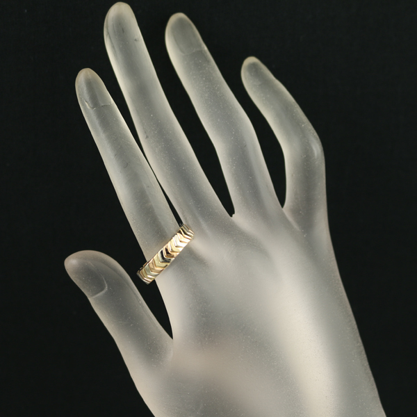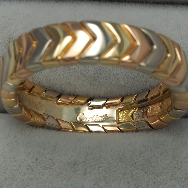 エタニティにデザインされたスリーゴールドの優雅な輝きが指元を包むカルティエのリングですよ。 |