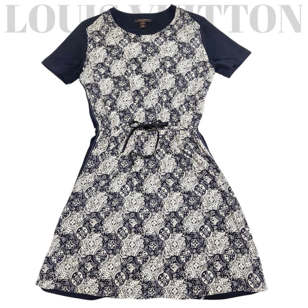 【美品 鑑定済】ルイヴィトン ワンピース モノグラム 34 S相当 異素材切替 LOUIS VUITTON ドレス シルク混 Aライン イタリア製