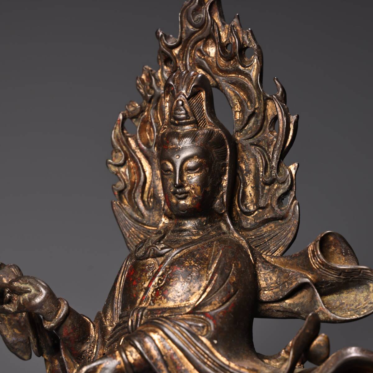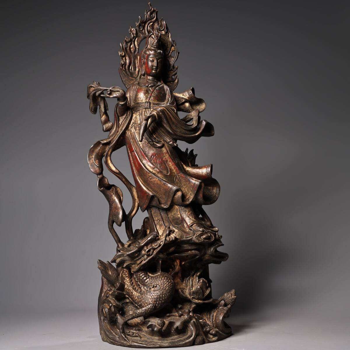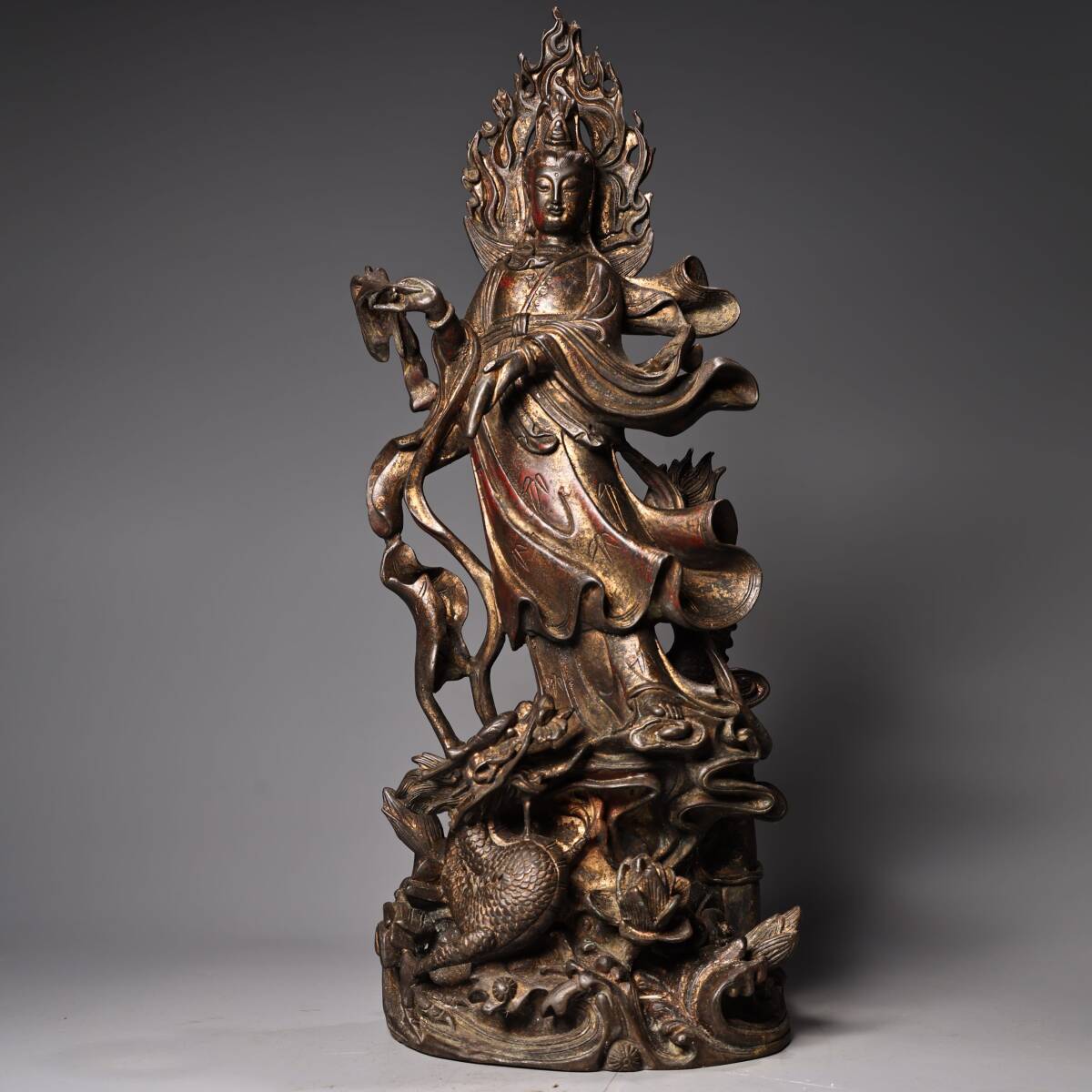 人間国宝9KH9985 中国骨董 銅製品 【純銅製の高浮き彫りの立龍観音菩薩像】 中国古美術 置物 工芸品 旧蔵 珍品 工芸品