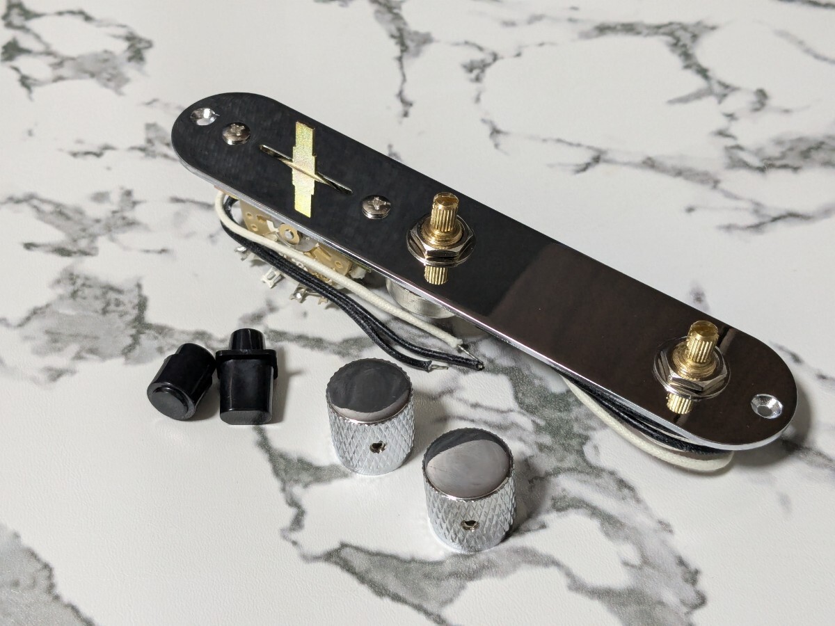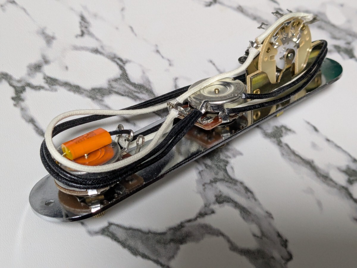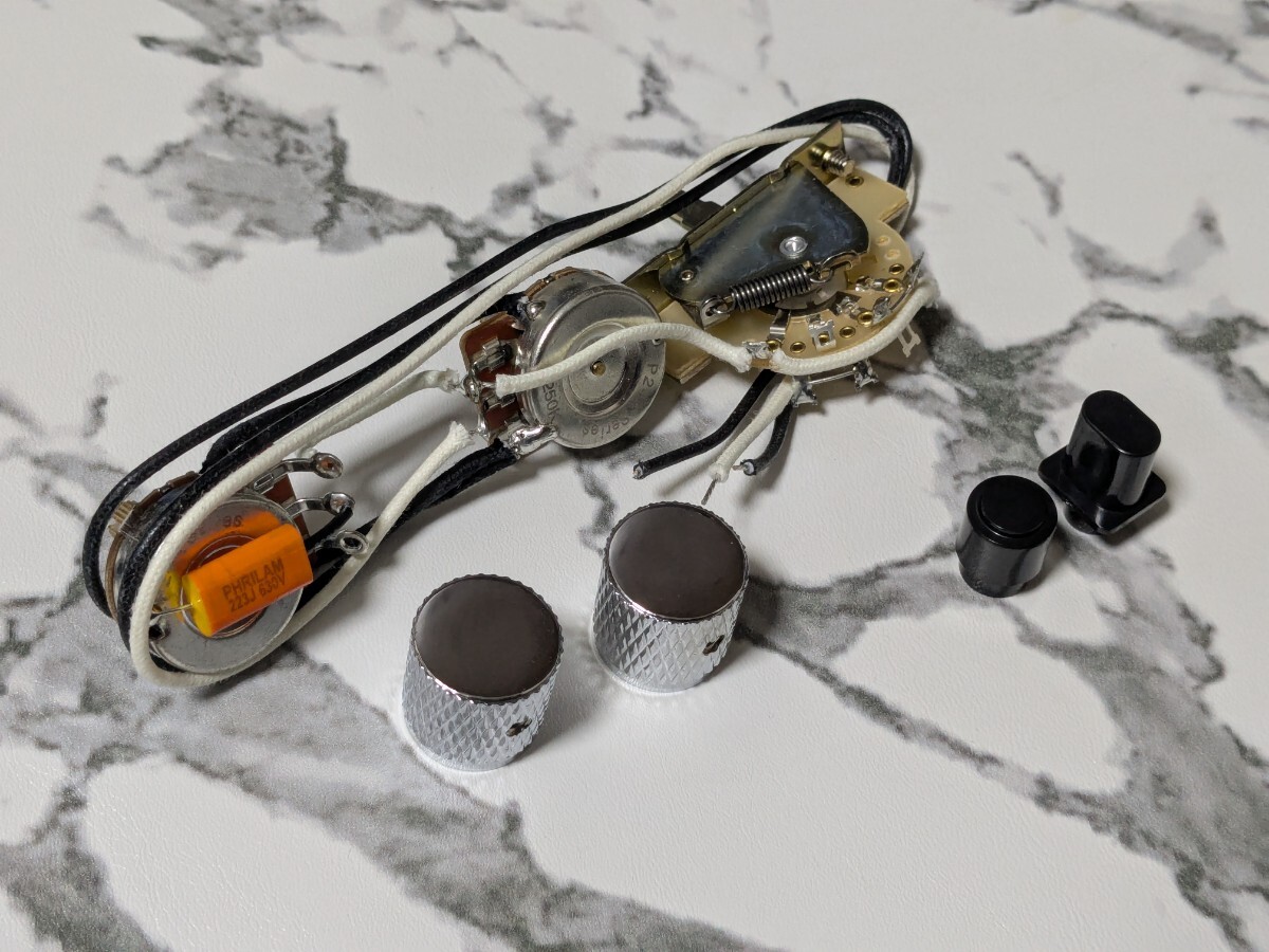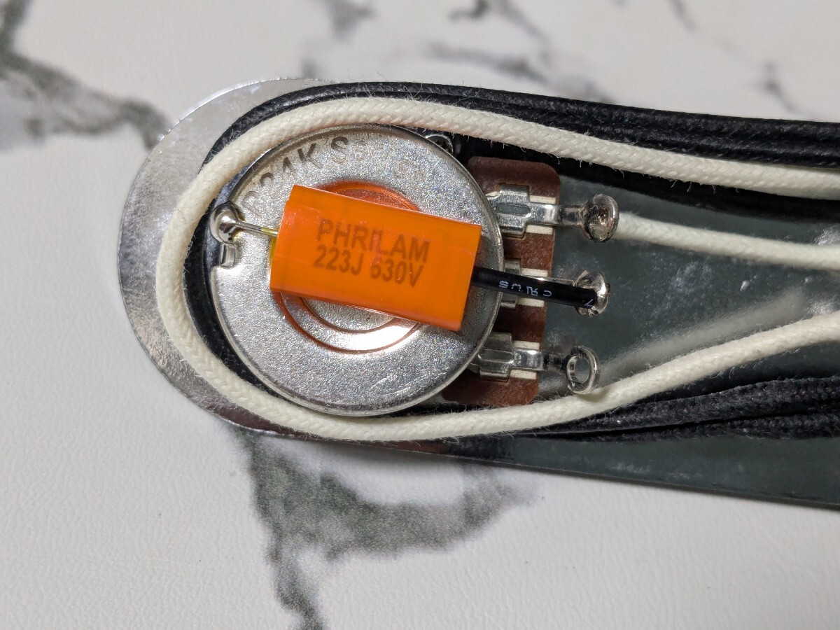0.022μf630Vオレンジコンデンサー、250kΩブラスシャフトポッド、クロスワイヤー、高耐久のオープンスイッチが使用されてありグレードアップにおすすめです。